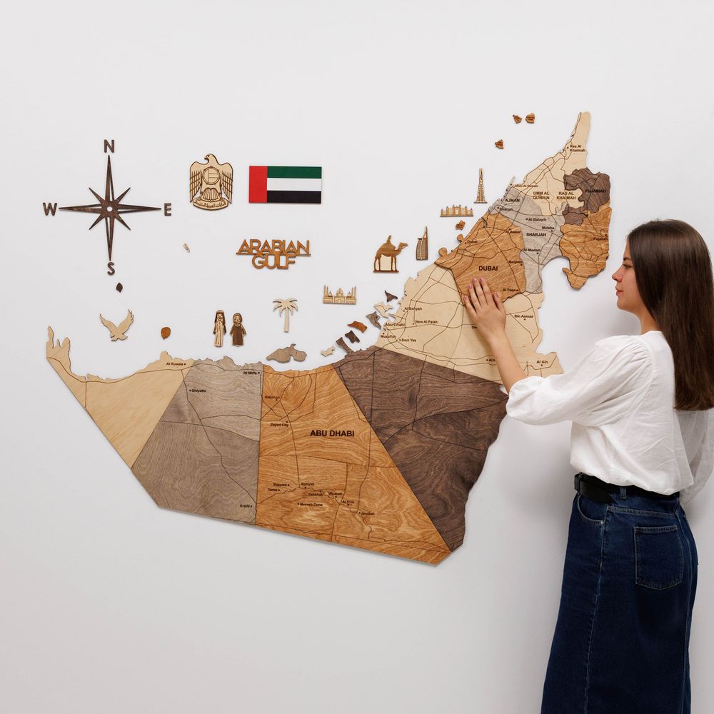 Please Note: This map is designed for decorative purposes and may not provide precise geographical accuracy of the UAE. Each map is a unique masterpiece, showcasing natural variations in wood grain and color that enhance its character and individuality 🌲.