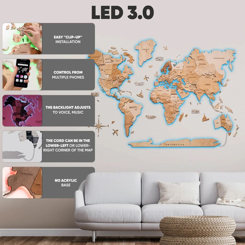 The 3D Wooden World Map LED - Light is available in multiple sizes to suit your space: M (100 x 60cm), L (150 x 90cm), XL (200 x 120cm), XXL (300 x 175cm). Whether you hang it in your living room, bedroom, or office, this map will become a striking focal point that adds style and personality to any room.