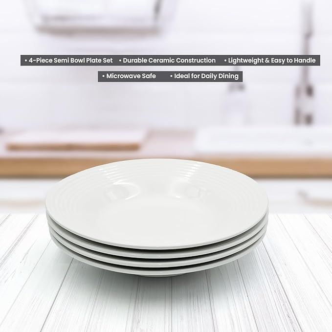 Serve your meals with style using this elegant 4-Piece White Ceramic Semi Bowl Plates Set, designed with a shallow-deep shape perfect for snacks, salads, pasta, noodles, soups, desserts, fruits, and everyday dishes. Made from premium ceramic, these plates are durable yet lightweight for easy handling.The clean white finish with subtle ridged detailing adds a modern touch to any table. Microwave-safe and easy to clean with a smooth glazed surface, this versatile set is ideal for daily meals, entertaining guests, or meal preparation bringing both practicality and elegance to your kitchen.