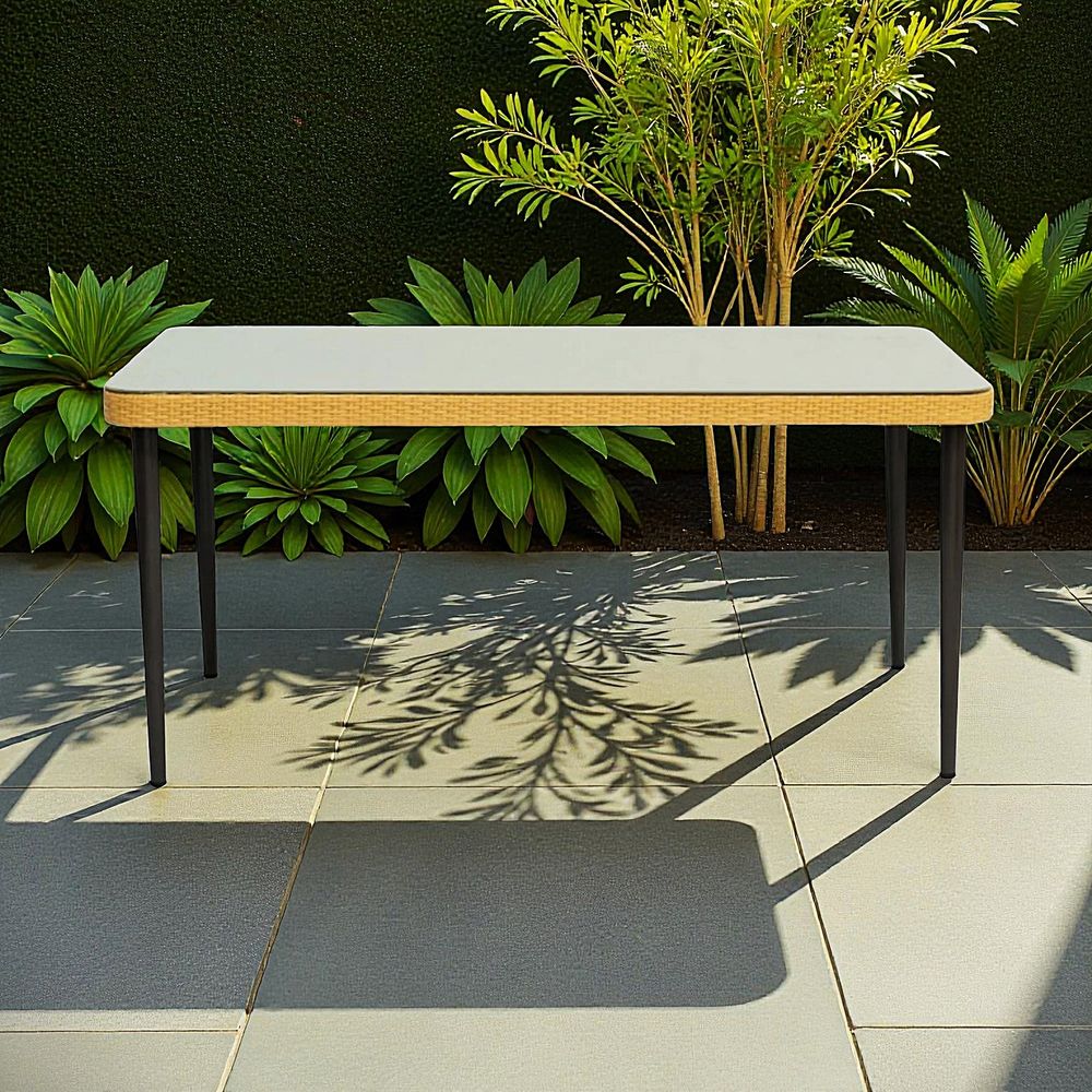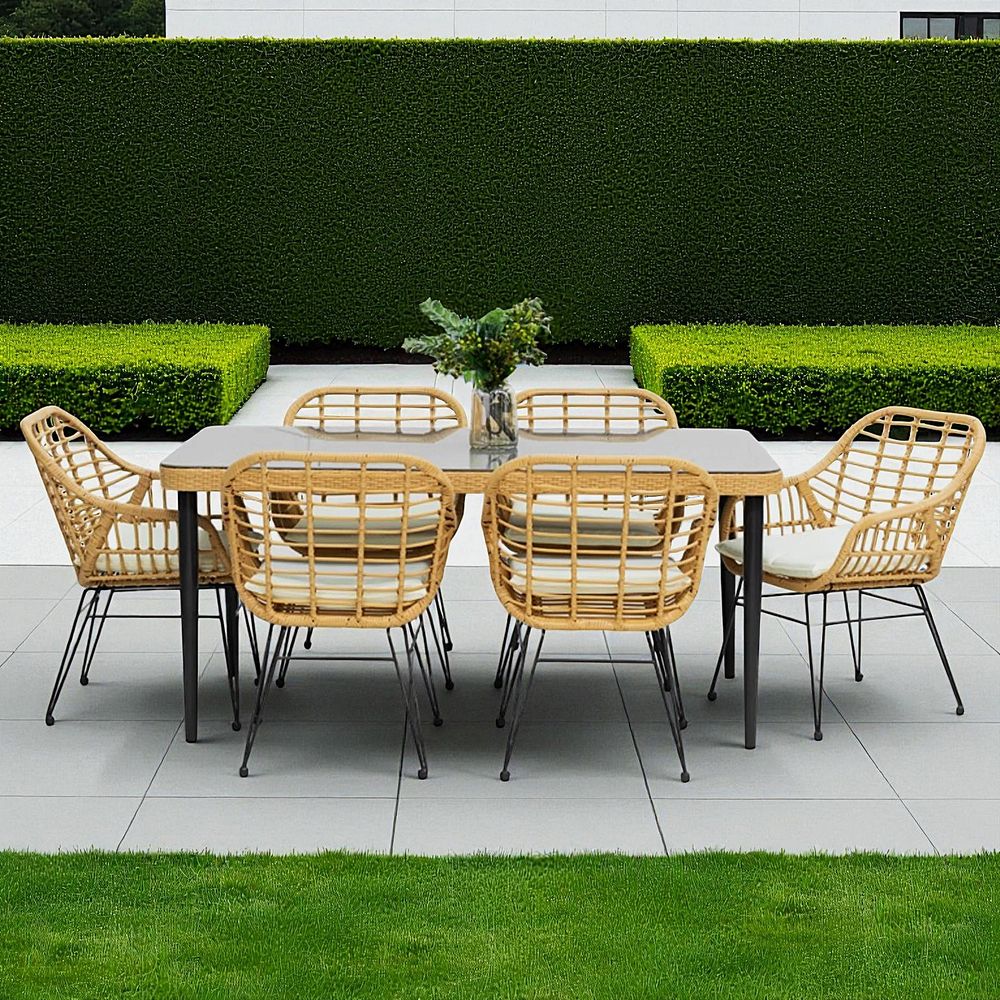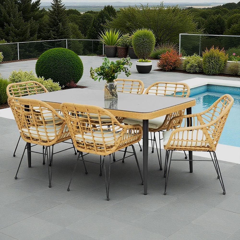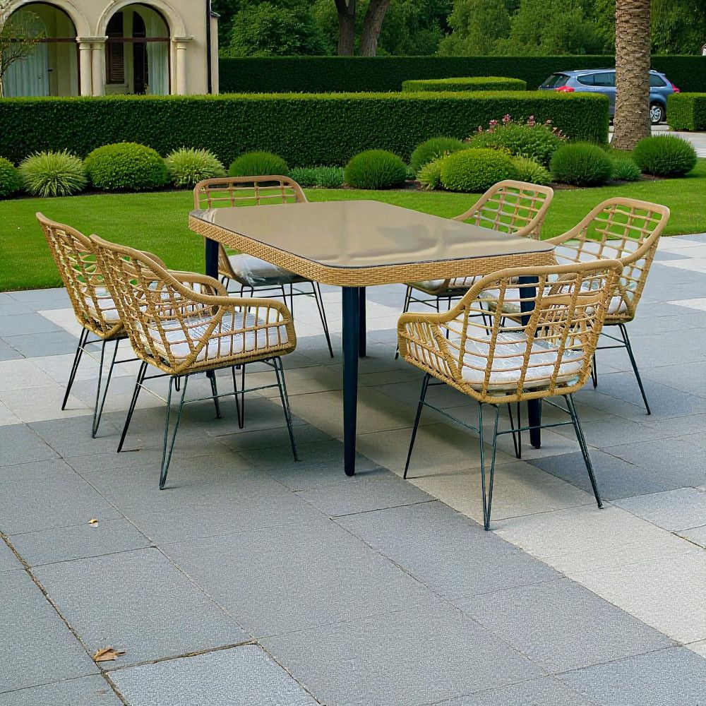 6-Seater Modern Outdoor Dining Set – Beige Rattan-Style Chairs with Steel Frame & Glass-Top Table