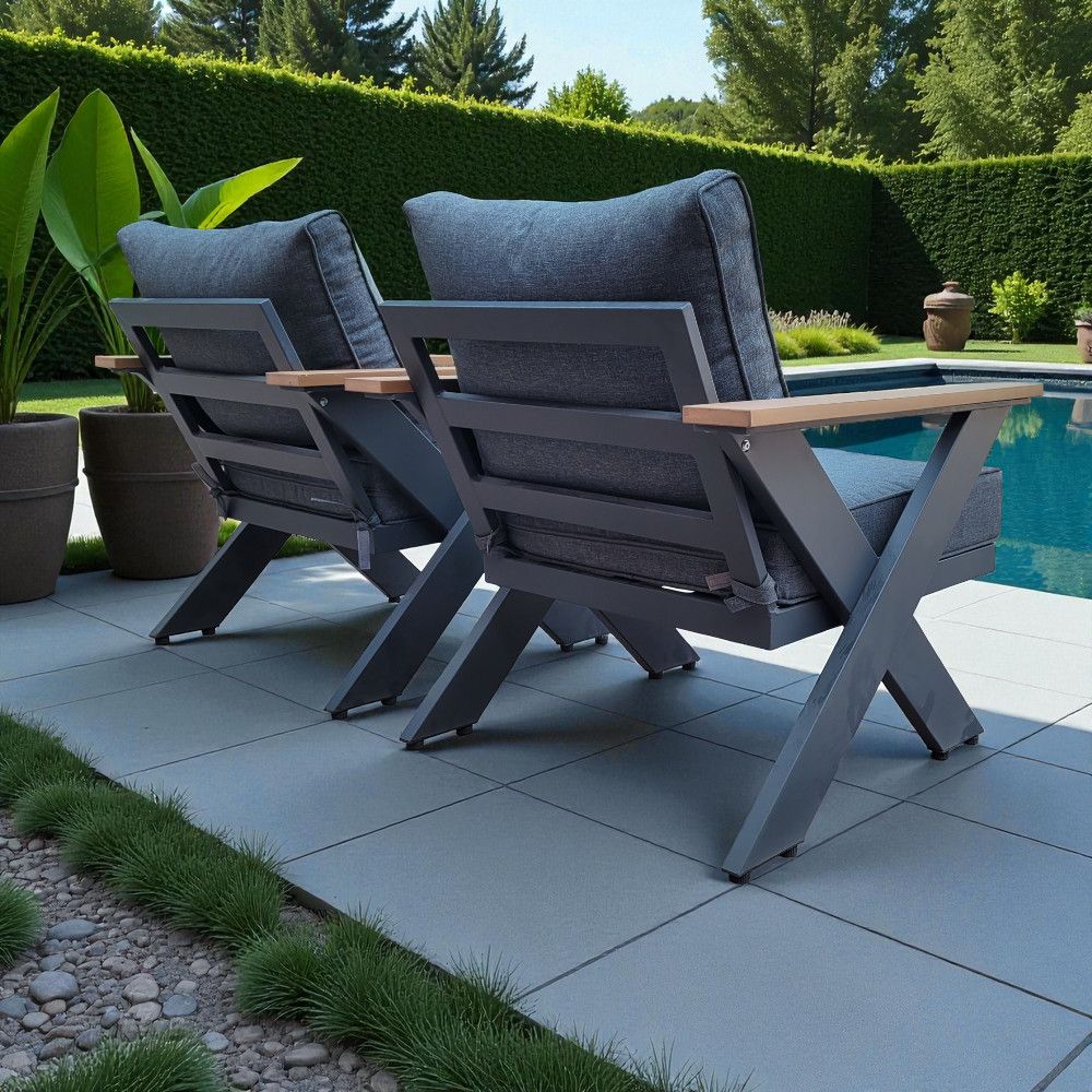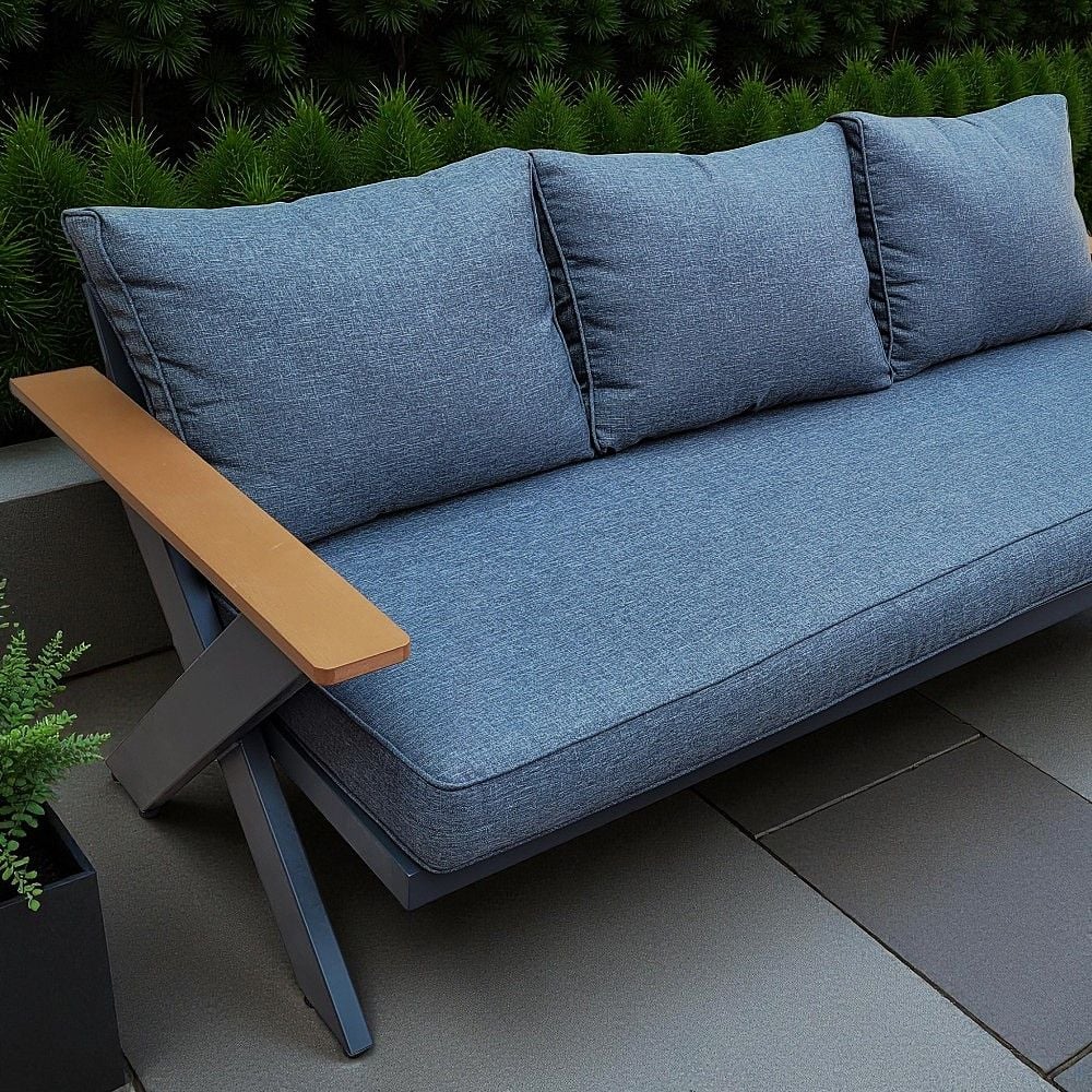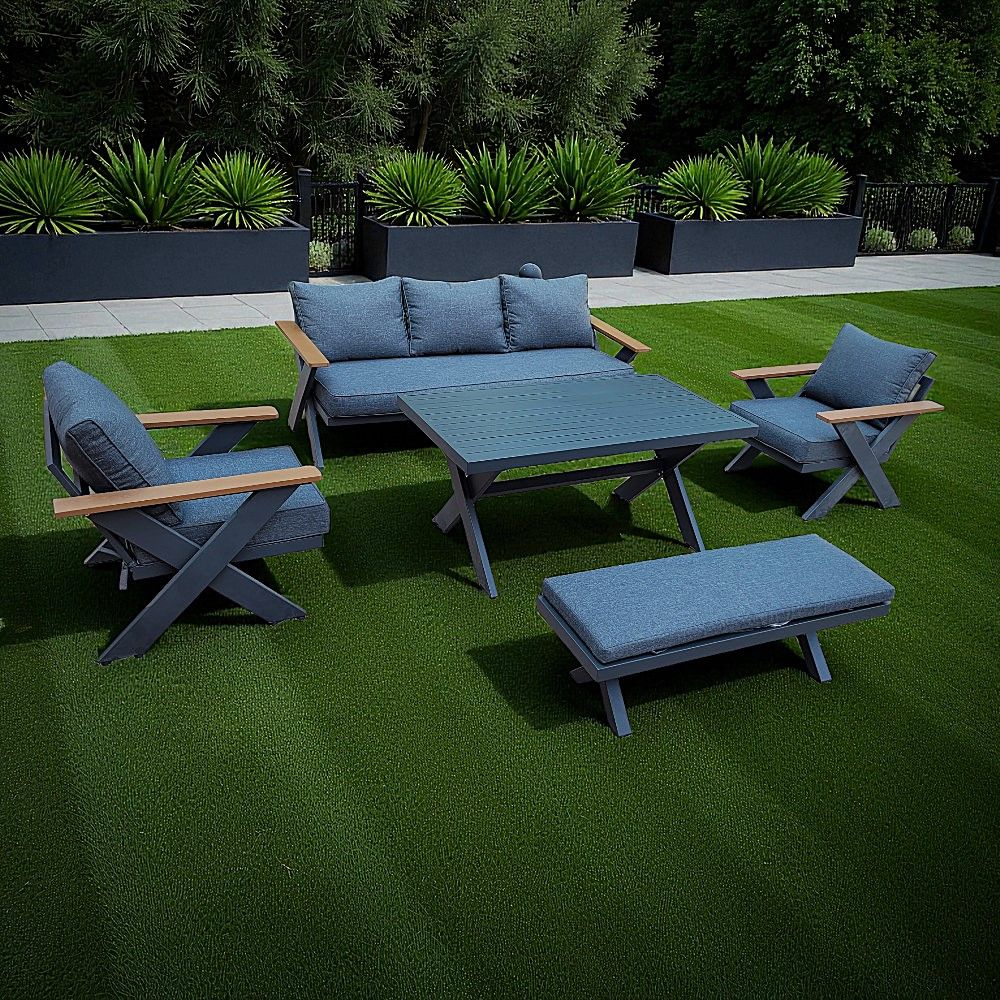 7-Seater Cross Legs Dark Grey Aluminium Garden Sofa with Big Table Wooden Color Arm Rests