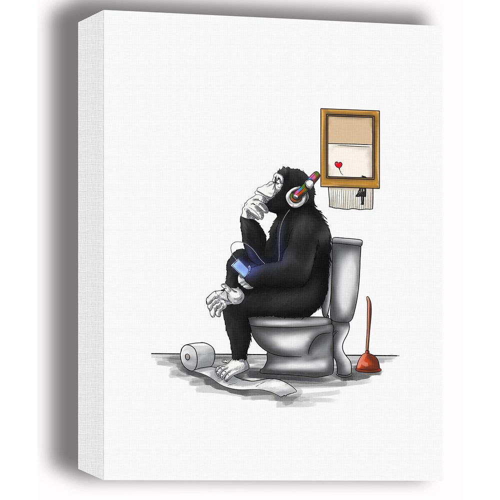 Blanche Gifts Black and White Banksy DJ Thinking Monkey Sitting on Toilet Seat Canvas Wall Art Print – Stretched on Wooden Frame and Ready to Hang – Size 12 x 16 in
