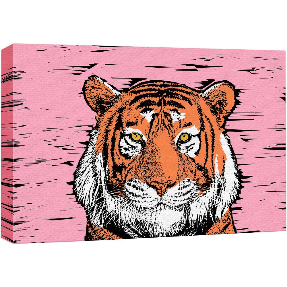 Canvas Print Wall Art Cartoon Style Tiger on Pink Background Graffiti & Street Art Nature Illustrations Pop Art Animals MultDark for Living Room, Bedroom, Office - 16"x24"