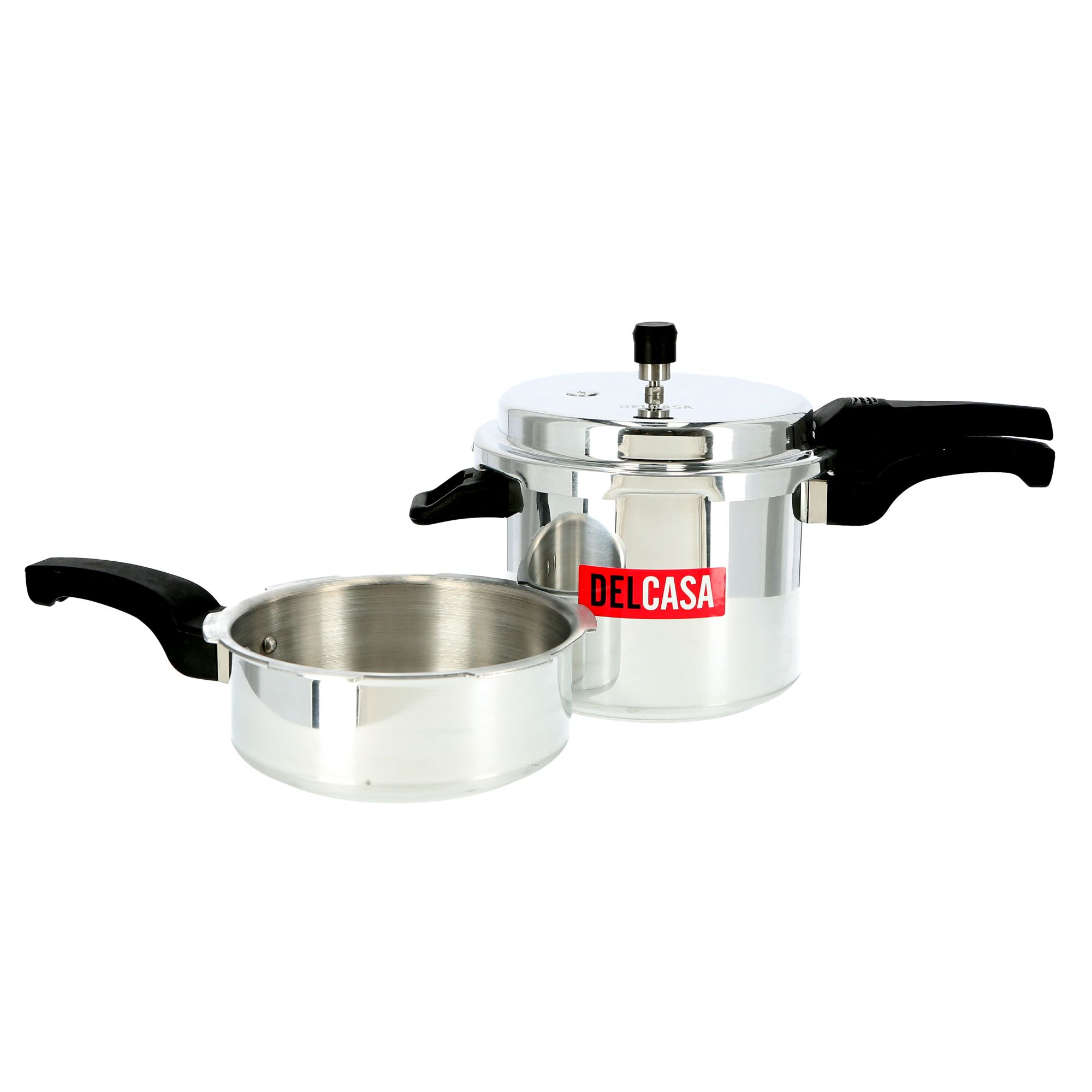Delcasa DC1124 5L+3L Aluminium Pressure Cooker Combo with Common Lid - Healthier Cooking in no time, suitable for everyday use. Pressure cooking is a quick, healthy, and more effective way of cooking food. Pressure cooking not only saves energy and time due to faster cooking periods but helps food retain more nutrients for healthier, tastier results. Cook meals in this all-in-one versatile piece of cookware and enjoy a cooler kitchen with less washing up to do after eating. Suitable for everyday use, this 5-liter/3-liter pressure cooker tough and is ideal for cooking gorgeous meals from scratch for the whole family when you are short of time. Brown, boil, steam, braise, stew, and roast, this pressure cooker is ideal for meats, fish, vegetables, and grains. Whether it's a hearty stew, spicy chili, or a succulent joint of roasted meat in as little as 30-40 minutes, pressure cooking offers the ultimate in fuss-free, one-pot cooking. A aluminium and three-ply compacting welding base suitable for all hobs including gas, electric, halogen, and ceramic hobs ensure optimum heat distribution allowing you brown, boil, steam, braise, stew, and roast in one pot, making the pressure cooker versatile cooking essential. Featuring an easy to clean pot, a simple hand wash is all that is required to keep the pressure cooker in perfect condition.
