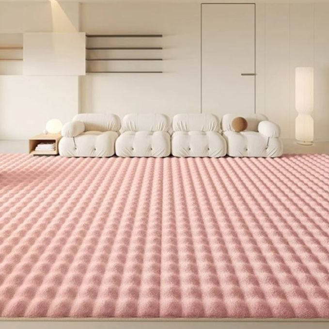 The product Modern Pink Bubble Al Alpaca Carpet With Anti Slip High Pile Bottom With Upgraded Foam Super Soft (Size 60×160CM) images have props used for illustrative purposes. Product Color may vary slightly due to photographic lighting or your screen settings.