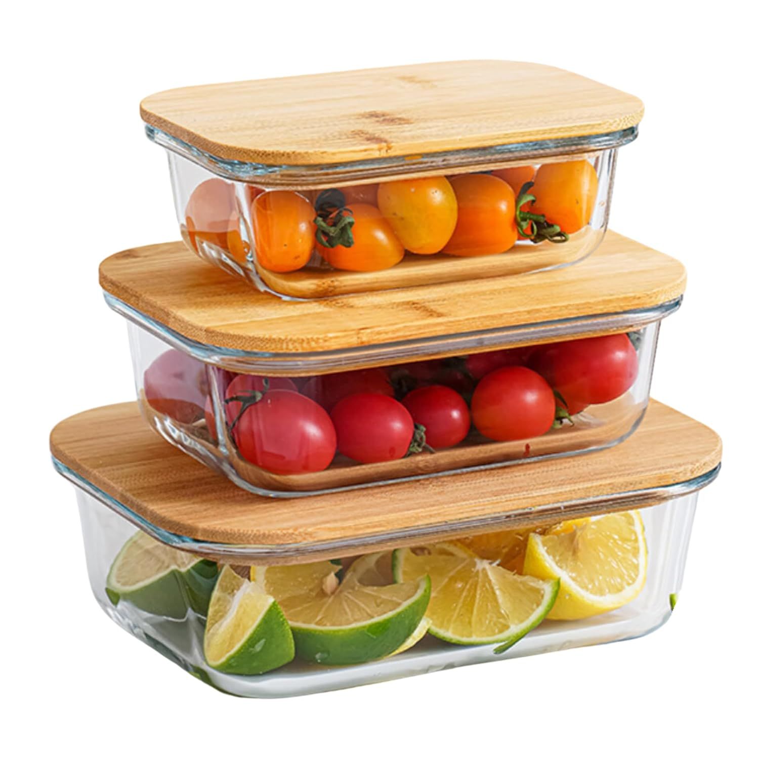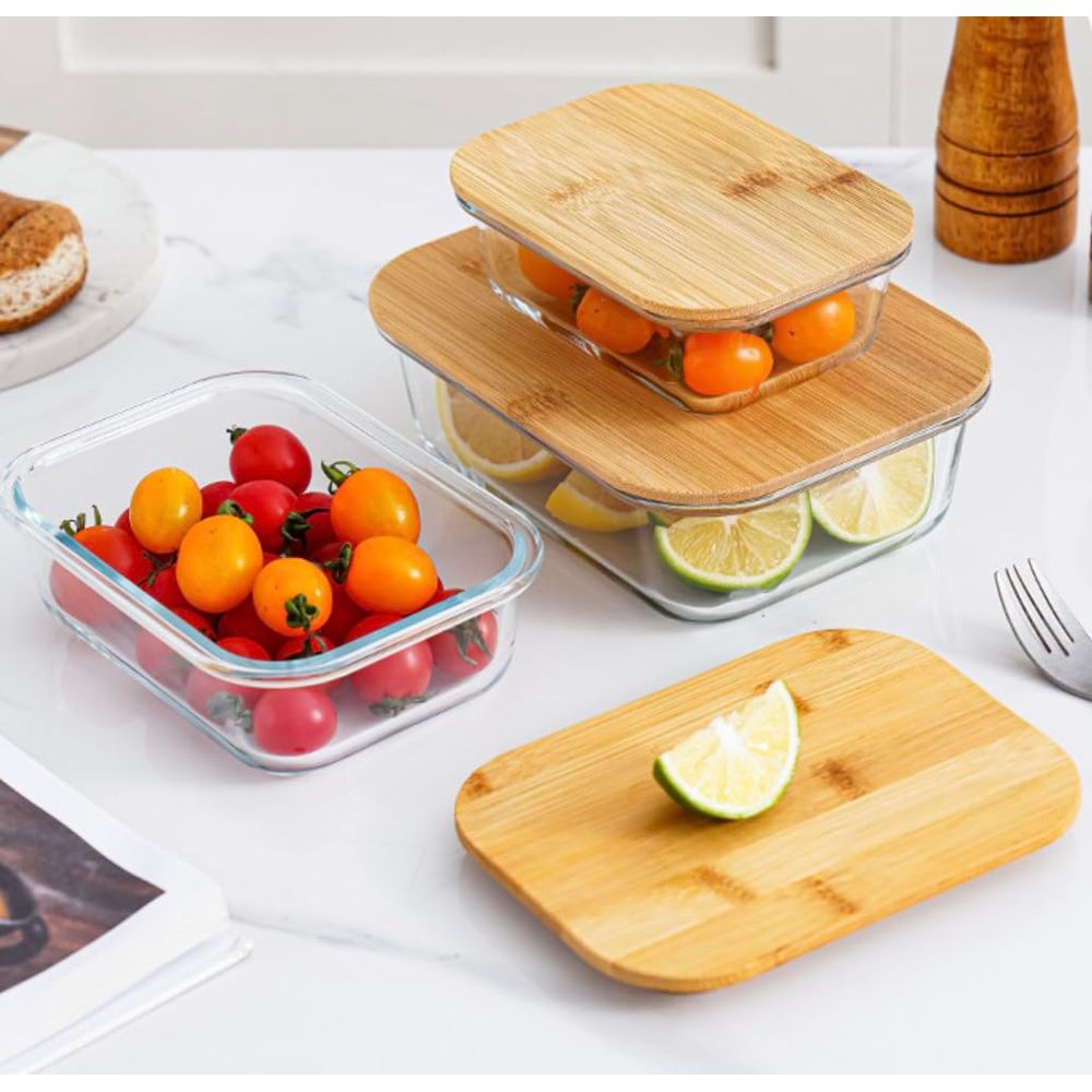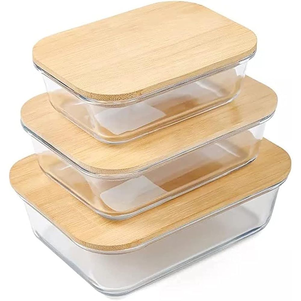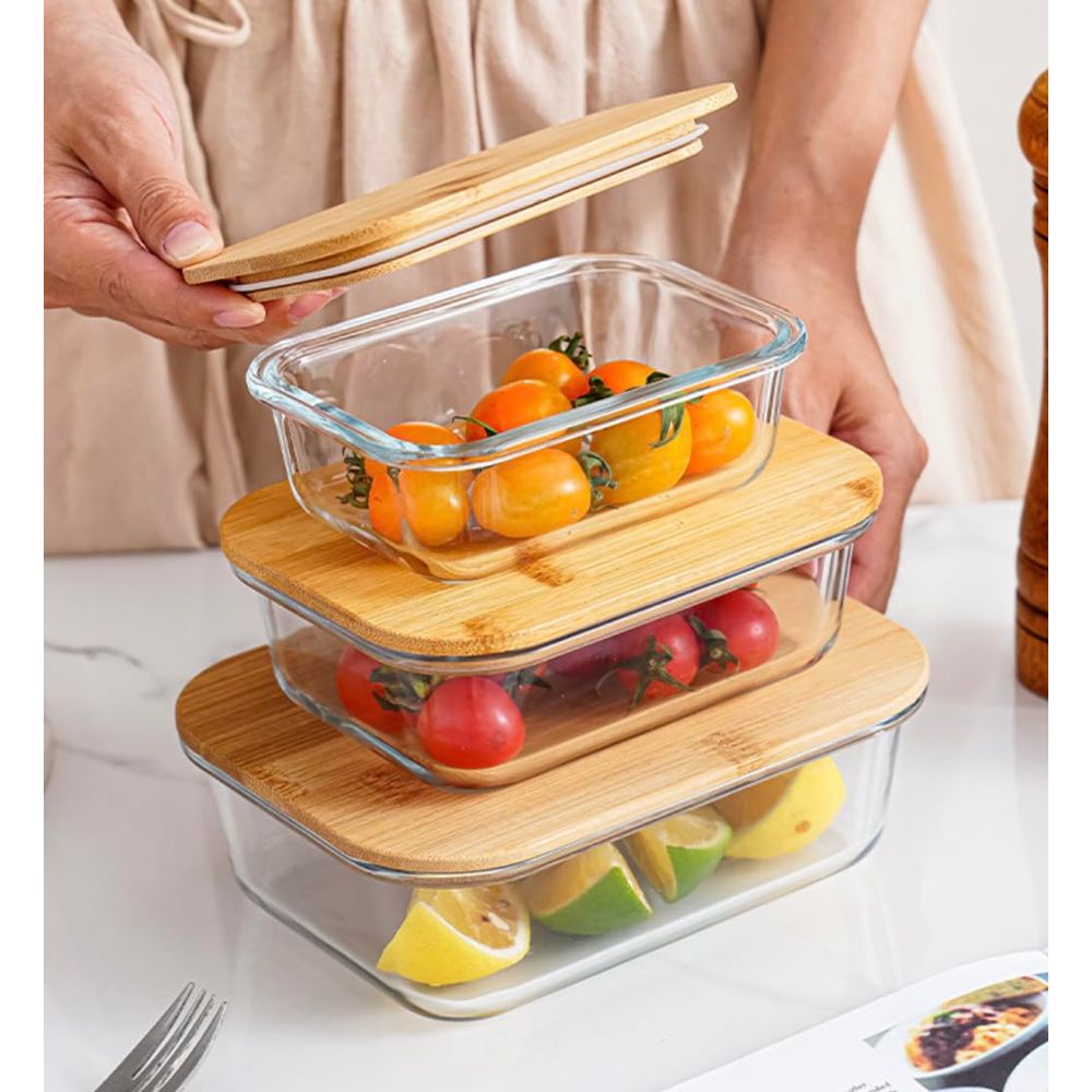 AtrauX Prep Glass Food Storage Containers Lunch Box with Bamboo Lid - Set of 3, Rectangular (410ml,680ml,1040ml)