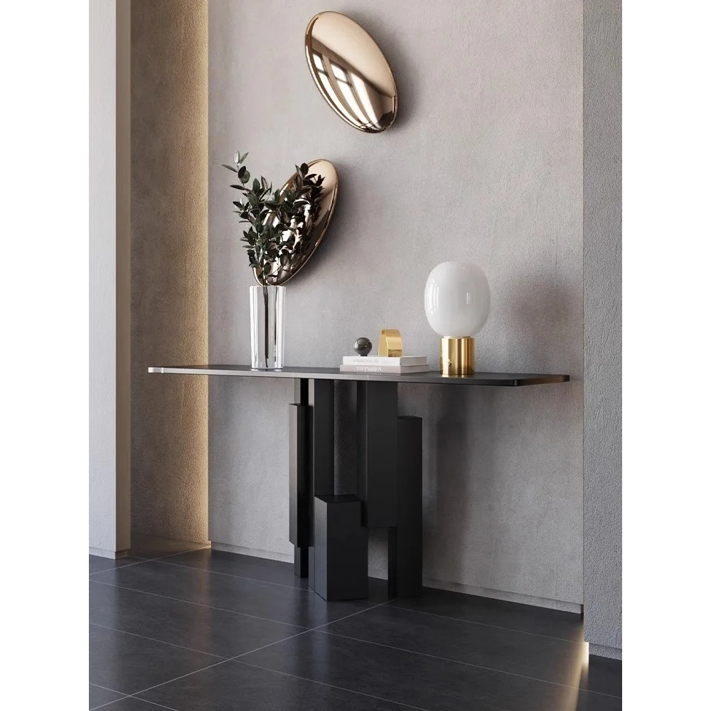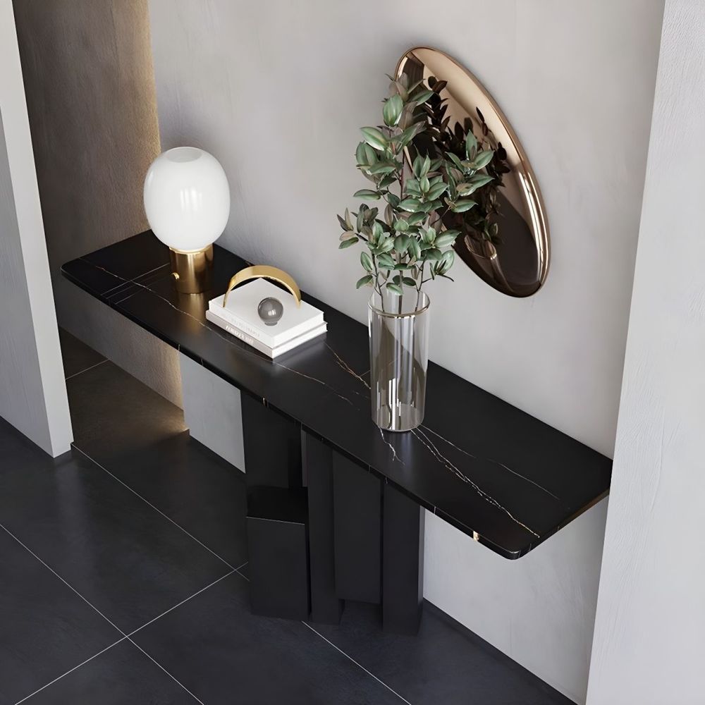 Elevate your interior with this sophisticated contemporary console table, featuring a luxurious black stone top and striking metal base.