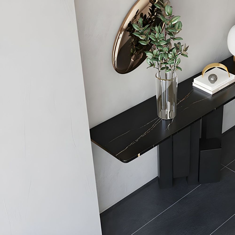 Black Console Table with Stone Top, Rectangular Entrance Table Abstract Metal Base 120cm Wide, Contemporary Design.