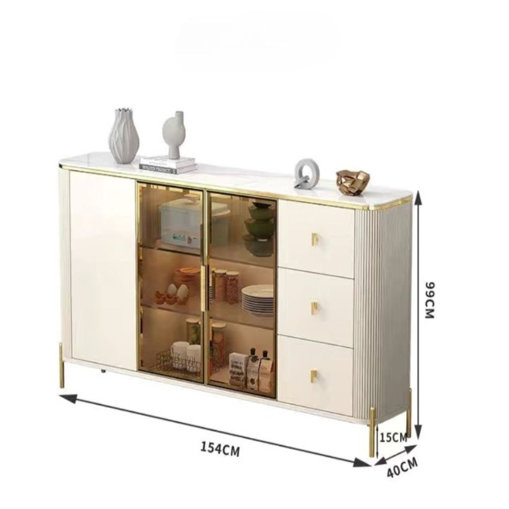 Specification: Dimensions: 154W * 40D * 99H cm Material: Solid Wood Top Material: stone Metal Material: Stainless Steel Application: Suitable for use in the living room, entryway, or dining area Transformable into a coffee bar or wine storage area Specific Use: Buffet Assembly: Assembled Care and Maintenance: -stone top is easy to clean and maintain with mild cleaning products -Wood surfaces may be cleaned with a soft, damp cloth