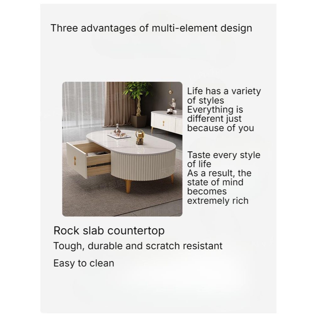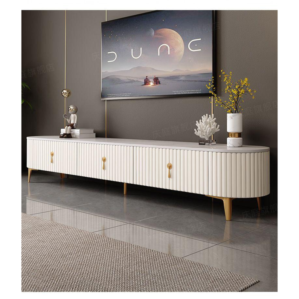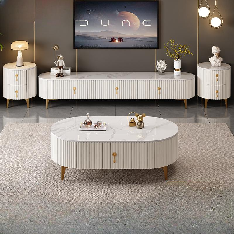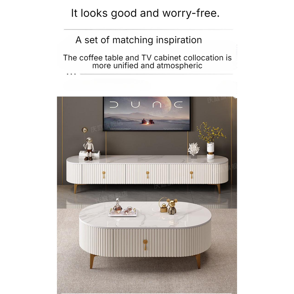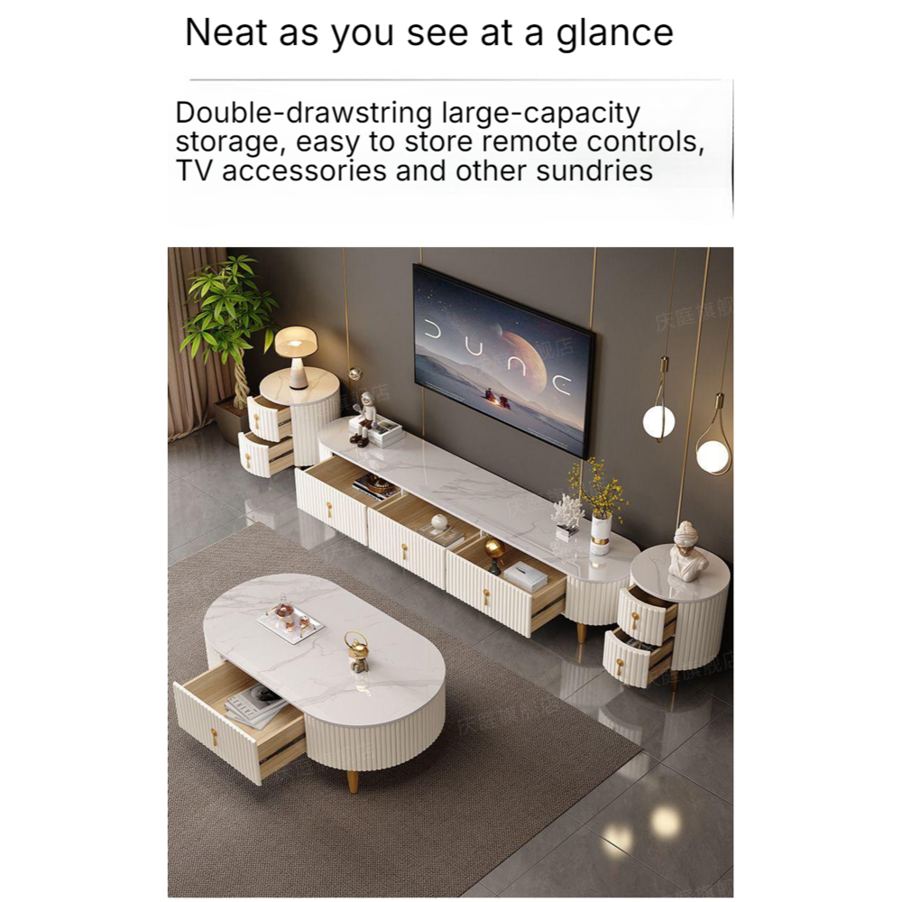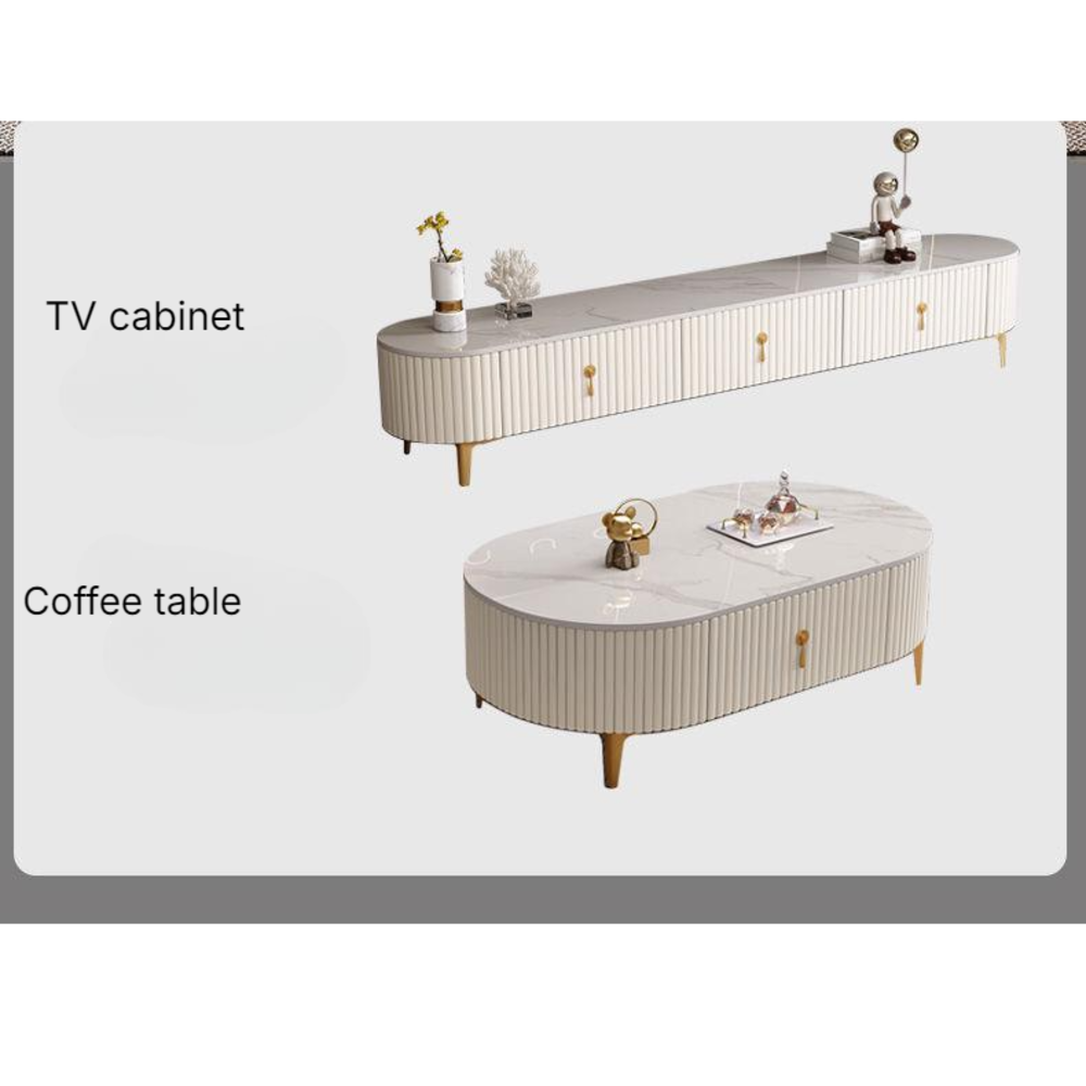 Elevate your living room space with this elegant ribbed off-white and gold legs living room table set, consist of Tv stand, coffee table and two side round tables. Designed to bring a touch of luxury and functionality to your home.