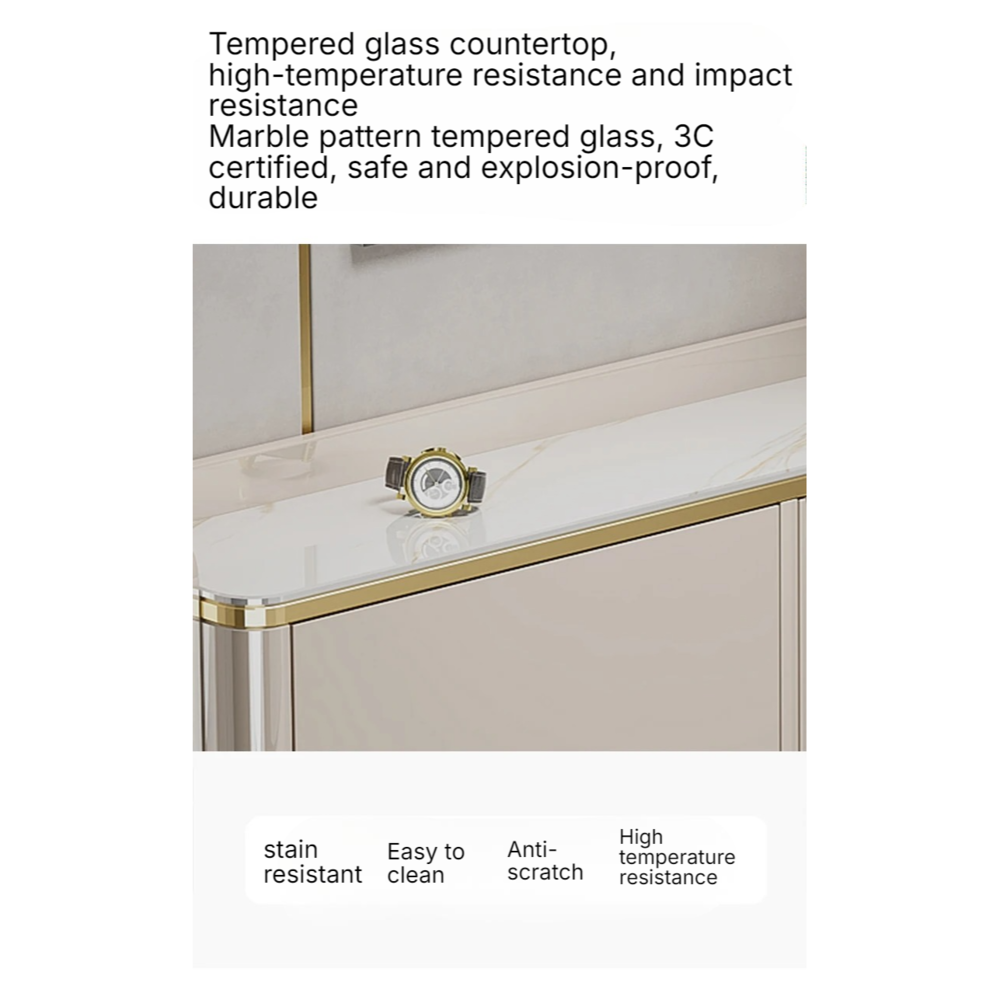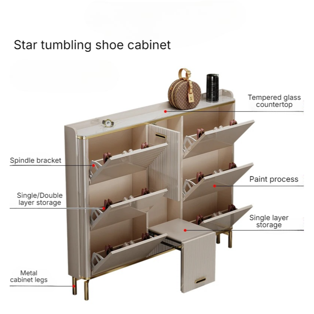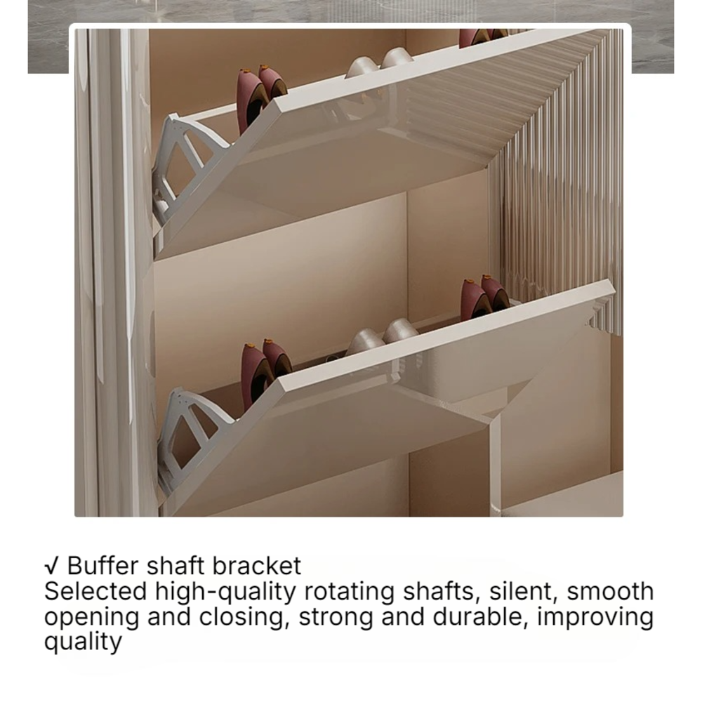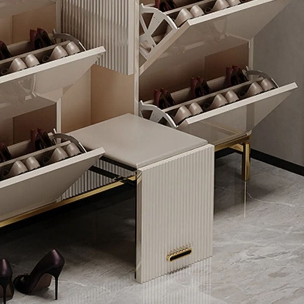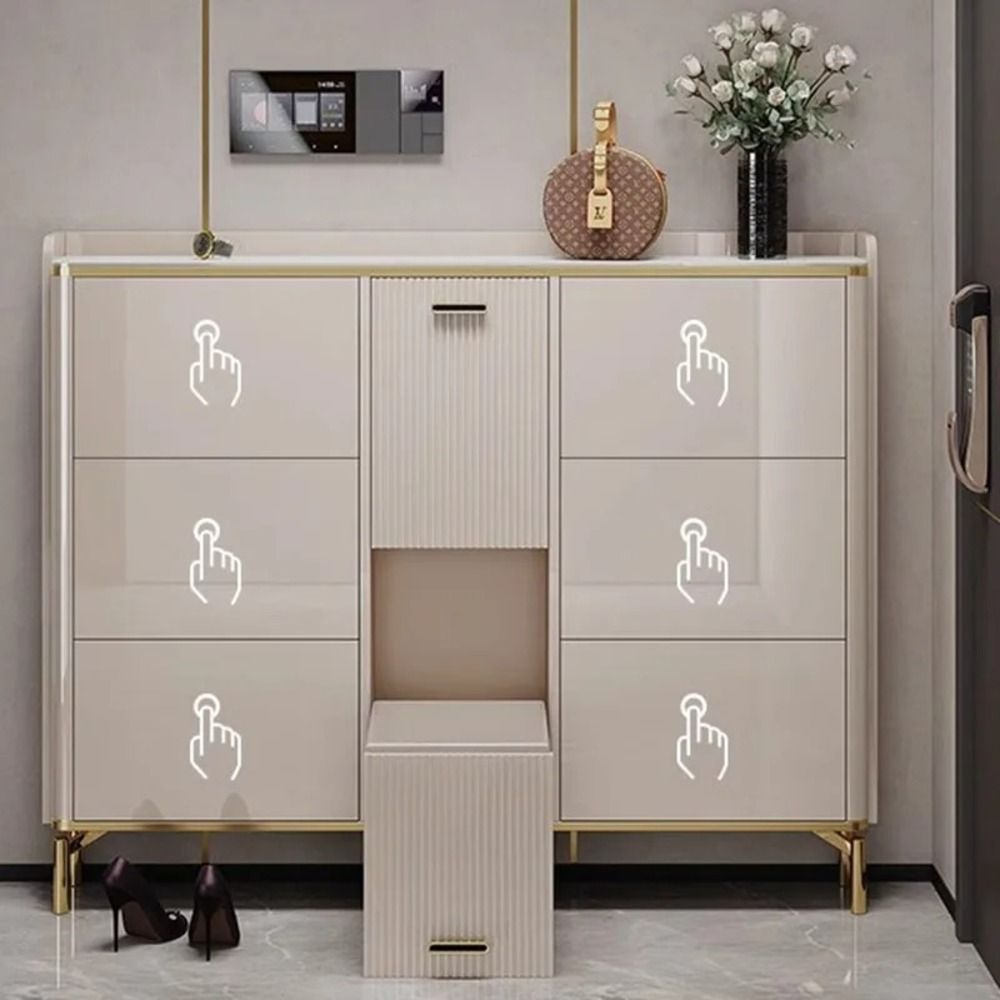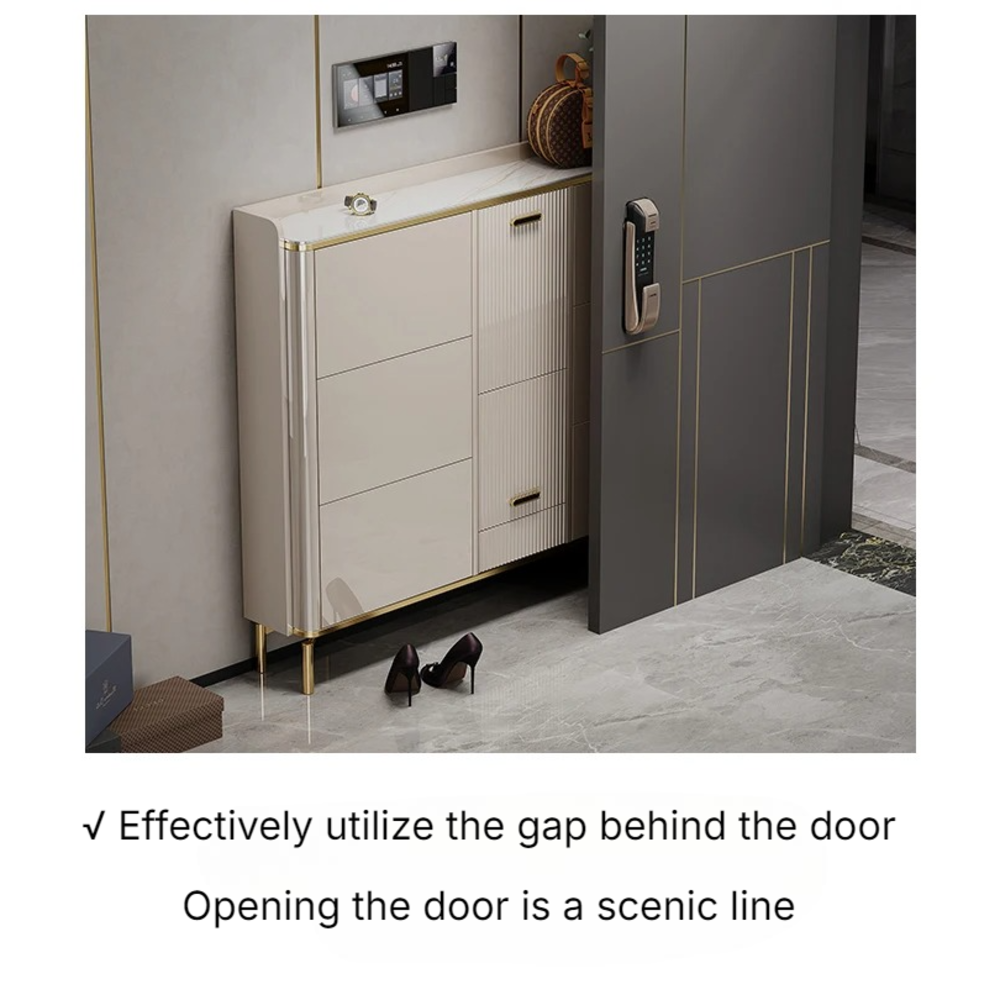 This modern shoe cabinet combines elegance and functionality, featuring a high-gloss finish and gold accents that add a touch of sophistication to any entryway or hallway.