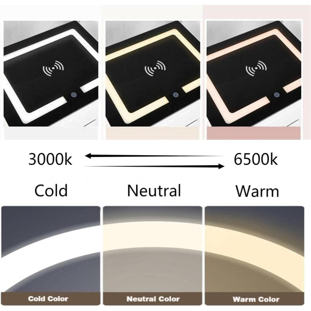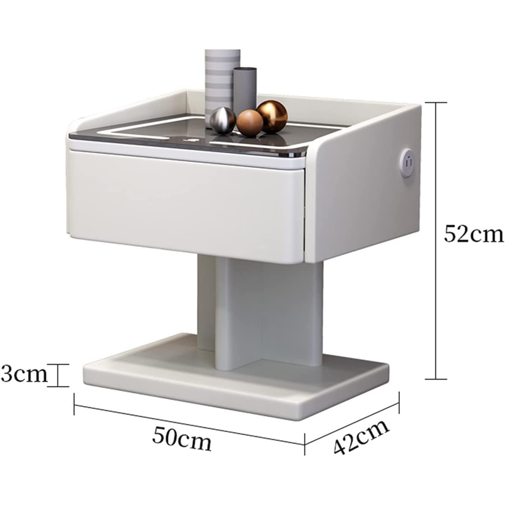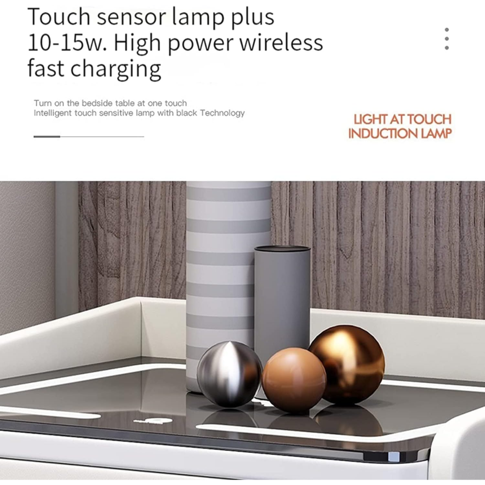 【Three Tone Light】 The smart nightstand is equipped with tempered glass desktop, which features better wear resistance and also for easy maintenance. Comes with a 3-color LED backlight (warm/cold/natural). Adjustable lighting effects by a simple press touch button.