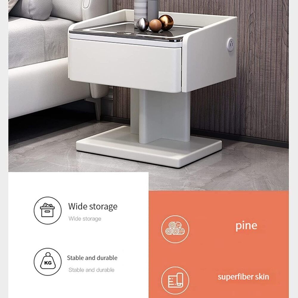 Smart Nightstand Bedside Table in One Drawer with LED Light, Wireless Charging, USB Ports - White