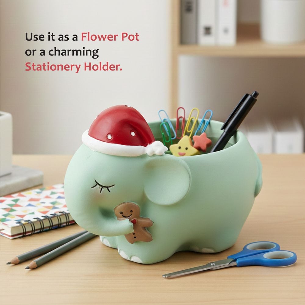 This adorable elephant planter, wearing a Santa hat and holding a gingerbread cookie, captures the spirit of the holidays with its warm, playful design