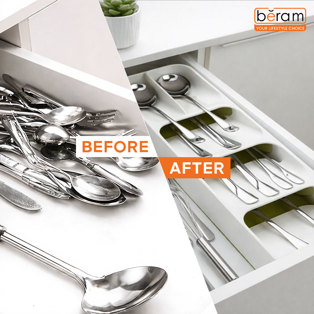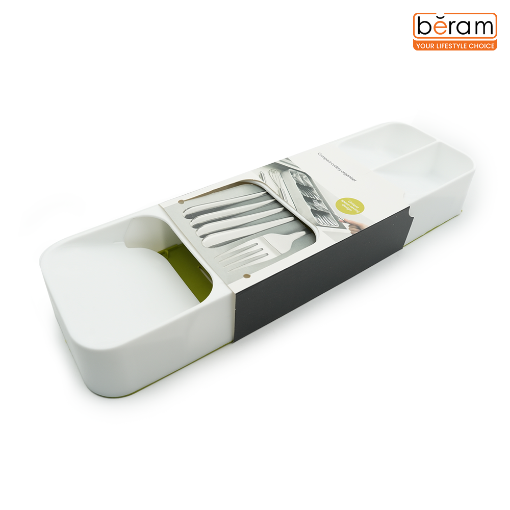 Beram Kitchen Drawer Cutlery Organizer Tray 39.6×11×5.5 cm Utensil Holder Rack for Spoons Forks Knives Compact Silverware Divider Storage Box Plastic Organizer Kitchen Tools Gadgets (White)