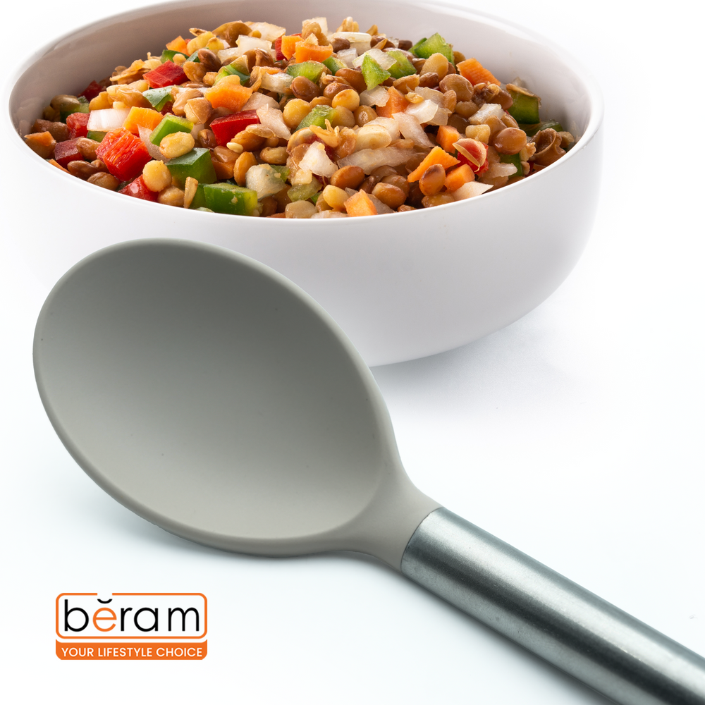 The Beram Silicone Serving Spoon is a versatile kitchen essential perfect for stirring, mixing, and serving a wide variety of dishes. Made from premium BPA-free silicone, this spoon is heat-resistant and safe for use on all non-stick cookware. It features a sturdy stainless steel core for durability and a smooth wooden handle for a comfortable grip. Its stylish grey color and functional design make it an ideal choice for both cooking and serving directly at the table.