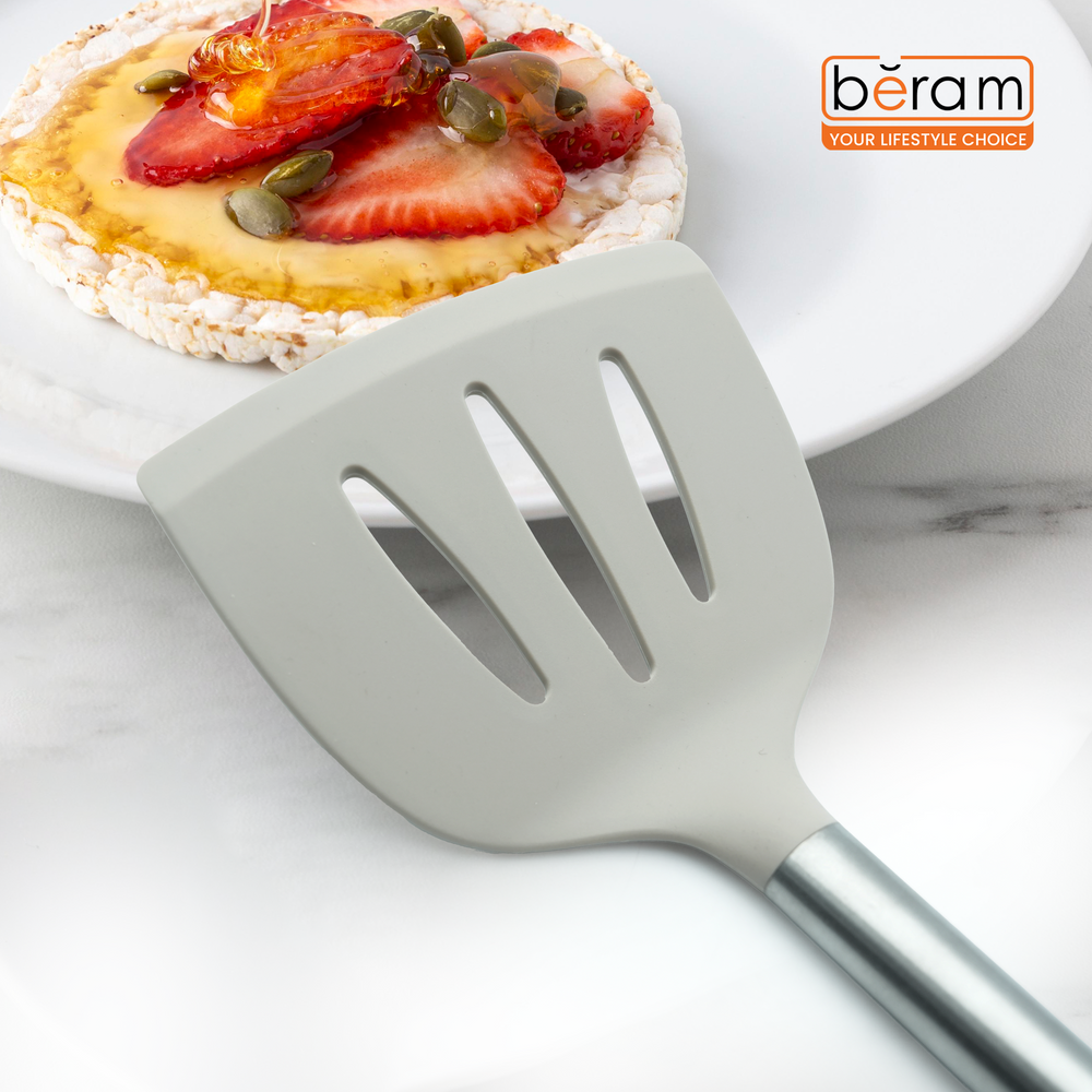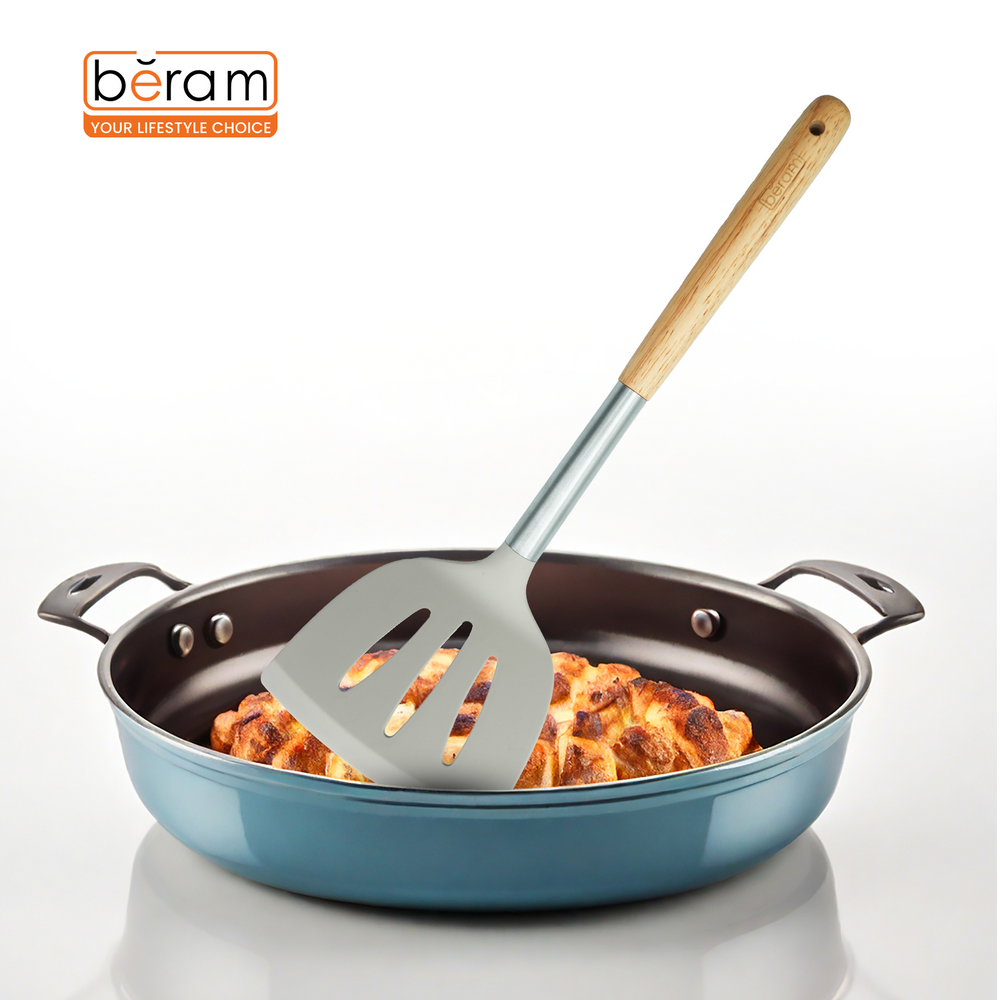 The Beram Silicone Slotted Turner is designed for versatile kitchen performance, perfect for flipping, draining, and serving foods with ease. Featuring a wide, heat-resistant silicone head with evenly spaced slots, it allows liquids and oils to drain while lifting food securely. Built with a stainless steel core for added strength and a natural wooden handle for a comfortable grip, this slotted turner is safe for use on non-stick cookware and brings both function and elegance to everyday cooking.