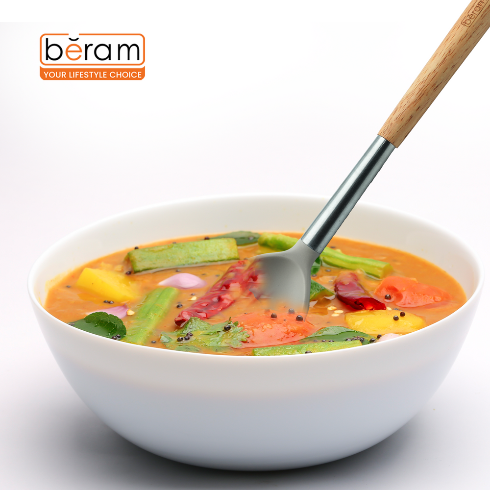 The Beram silicone slotted spoon is a versatile kitchen essential designed for effortless frying, stirring, and serving. Crafted with a heat-resistant, BPA-free silicone head and a strong stainless steel neck, it ensures safe cooking on non-stick surfaces. The ergonomic wooden handle provides a firm, comfortable grip, while the evenly spaced slots allow liquids or grease to drain quickly. Perfect for lifting vegetables, pasta, or fried items, this spoon combines durability, safety, and modern design in one reliable tool.