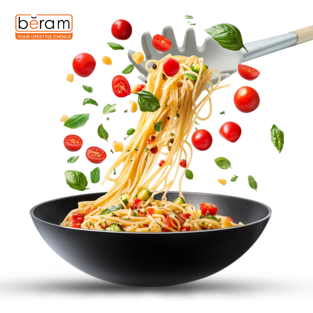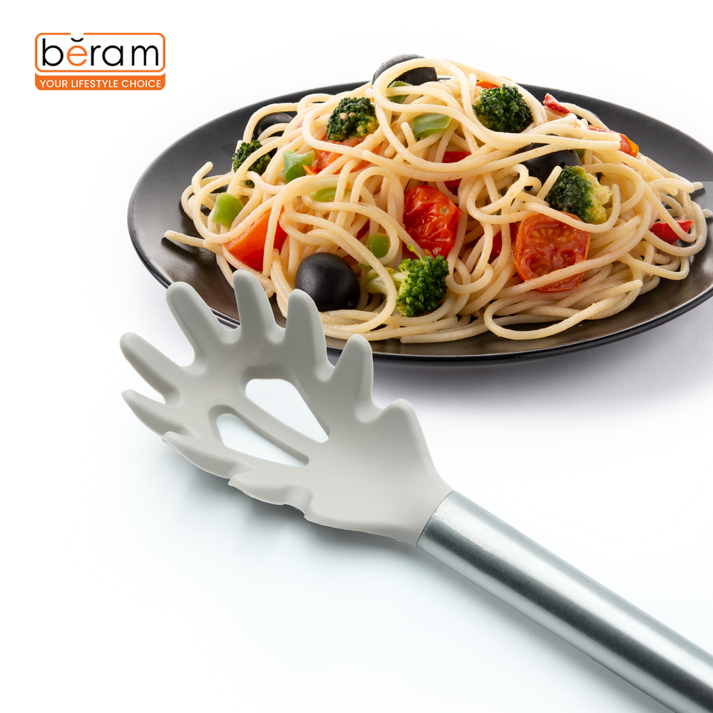 The Beram silicone spaghetti server is your go-to tool for handling pasta with ease and precision. Designed with a durable, BPA-free silicone head, it securely grips and lifts spaghetti, linguine, and other noodles without damaging them. The sturdy stainless steel core ensures strength, while the smooth wooden handle offers a comfortable, slip-resistant grip. Heat-resistant and non-stick safe, this stylish grey pasta server adds function and elegance to your cooking routine.
