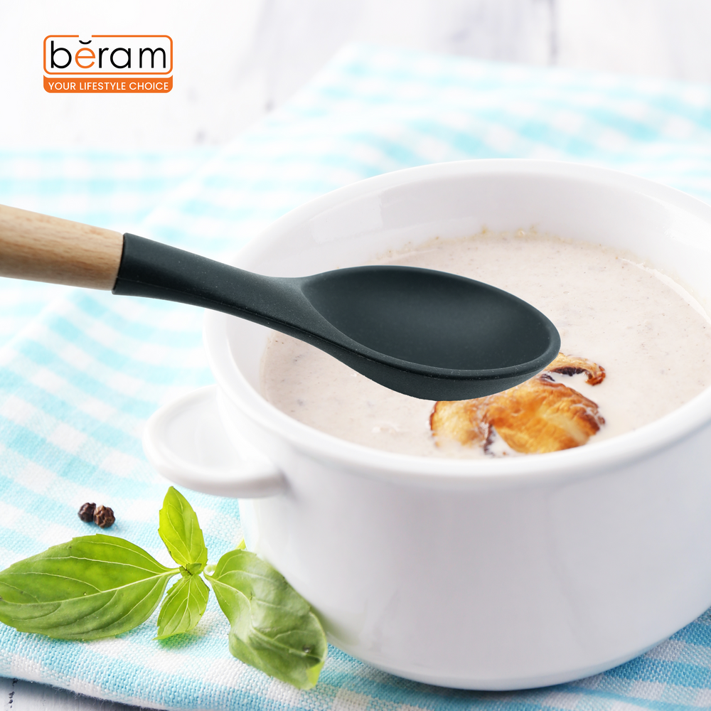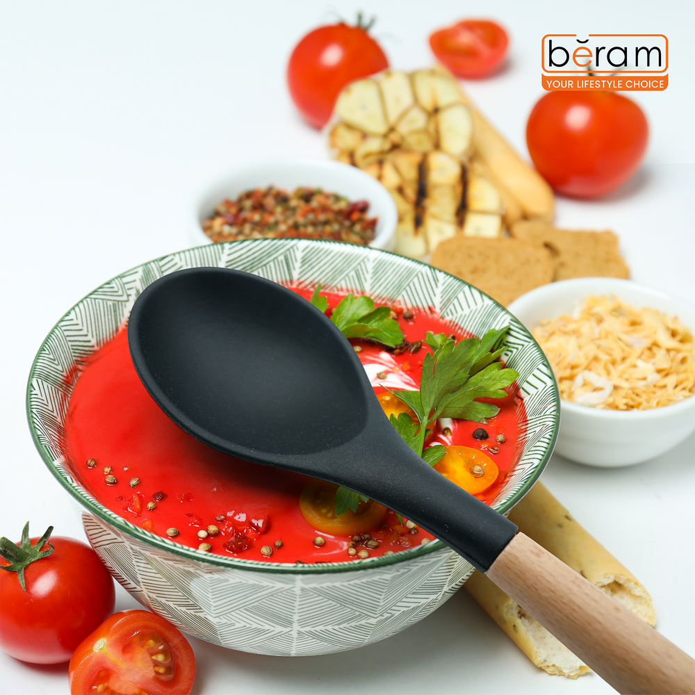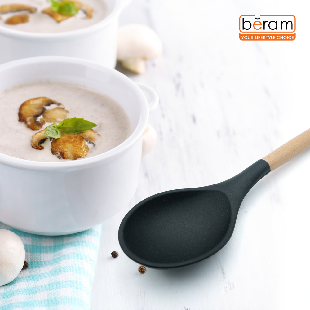 The Beram Black Silicone Cooking Spoon is the perfect blend of durability, style, and practicality for any kitchen. With a size of 7.5 × 31.5 cm, this spoon features a premium BPA-free silicone head that is heat resistant and safe to use on all cookware surfaces, including nonstick. The natural wooden handle offers a secure and ergonomic grip, ensuring ease of use during cooking, serving, or stirring. Designed to withstand high temperatures, this versatile kitchen utensil is ideal for mixing sauces, scooping food, and serving meals with precision. Its sleek black finish and wood handle bring a touch of elegance to your utensil collection while ensuring long-lasting use.