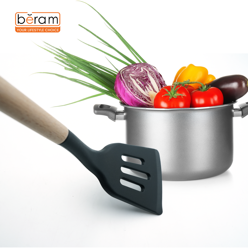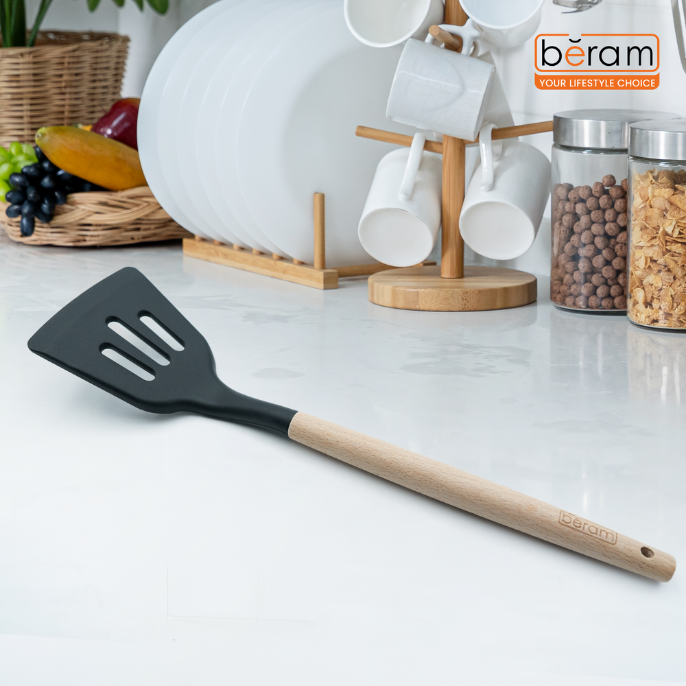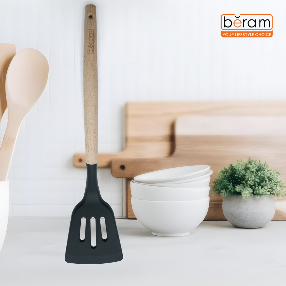 Elevate your cooking experience with the Beram Silicone Slotted Turner, expertly crafted with a BPA-free, heat-resistant black silicone head and a sturdy natural wooden handle. Measuring 8 × 32 cm, this turner is ideal for flipping, frying, sautéing, and draining excess oil thanks to its strategically placed slotted design. The non-stick safe silicone ensures your pans remain scratch-free, while the ergonomic wooden grip adds a touch of elegance and superior control. Designed for high performance in the kitchen, this durable and stylish tool is perfect for home chefs and professionals alike.