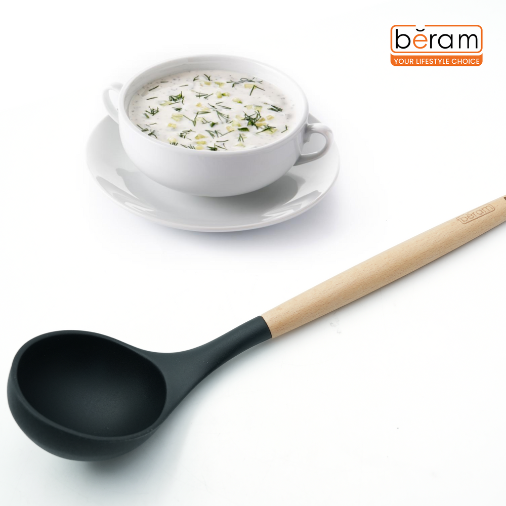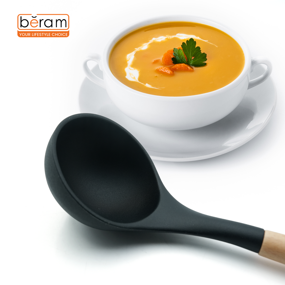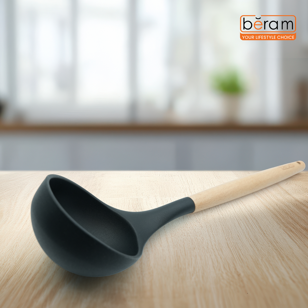 Elevate your kitchen experience with the Beram Silicone Soup Ladle, designed with a deep, rounded bowl perfect for effortlessly serving soups, stews, curries, and sauces. Crafted from premium BPA-free, food-grade silicone, this ladle is heat-resistant and safe for all cookware types, including delicate non-stick surfaces. The ergonomically shaped natural wood handle ensures a comfortable, slip-free grip while adding a modern touch to your kitchen décor. Durable, non-scratch, and stain-resistant, this 8 × 31.5 cm ladle is a must-have utensil for everyday cooking and elegant serving. A convenient hanging hole allows for easy storage, while its sleek black tone adds style and versatility to your utensil collection.