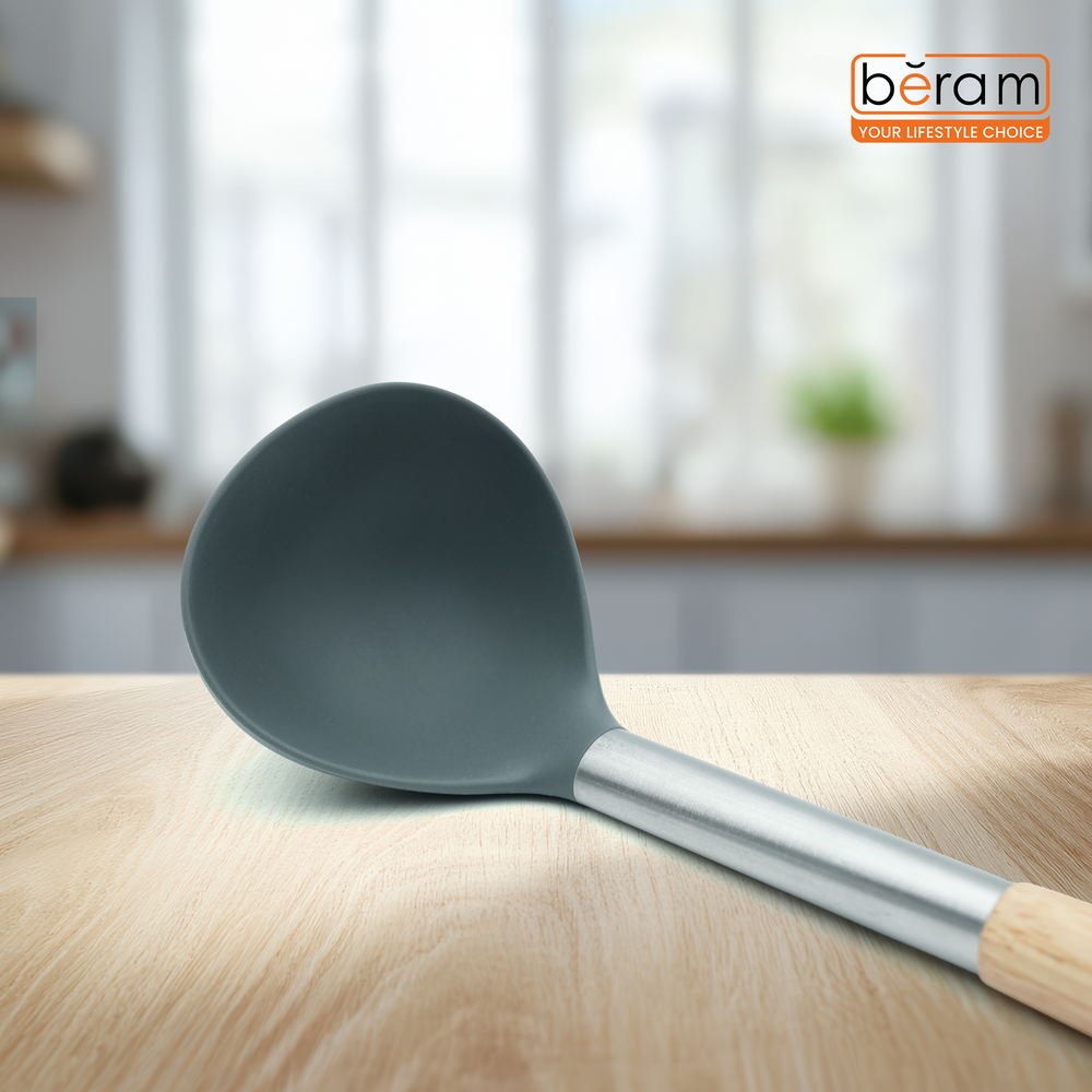 Beram Silicone Spatula Set With Wooden & Steel Handles, Heat-Resistant, Bpa-Free, Non-Stick Safe Grey (Single Soup Ladle)