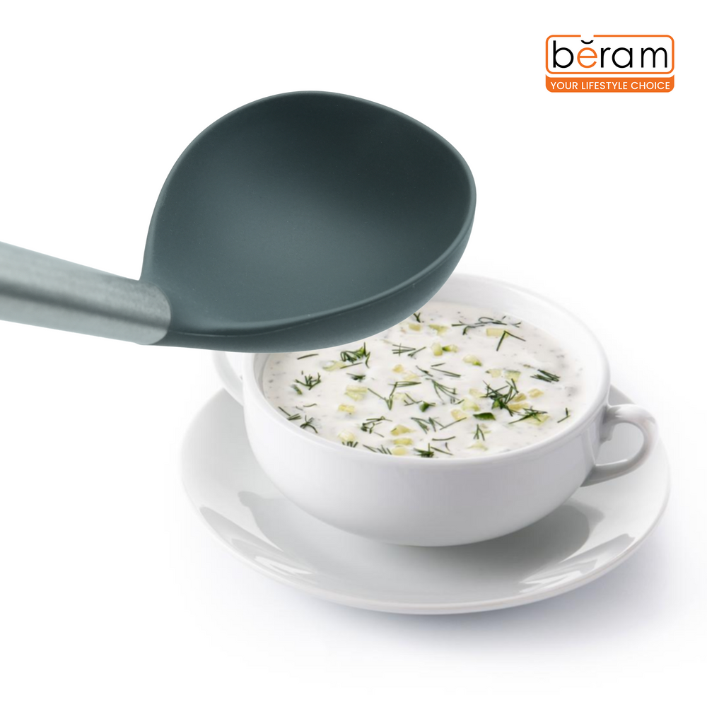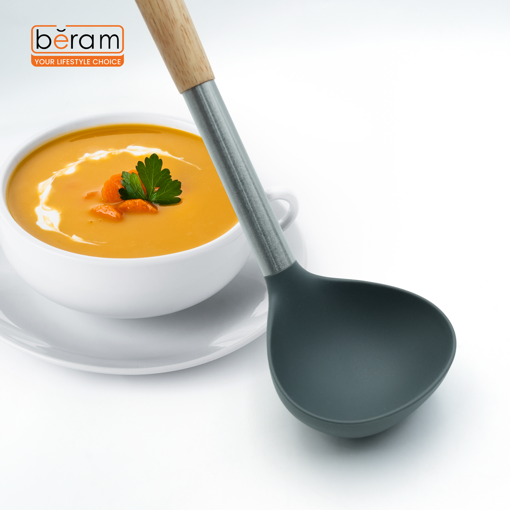 Serve your favorite soups, stews, and broths in style with the Beram Grey Silicone Soup Spoon. Thoughtfully crafted with a heat-resistant silicone head, reinforced stainless steel shaft, and ergonomic wooden handle, this kitchen essentially combines strength, comfort, and safety. Its wide, deep bowl is ideal for scooping and serving liquid-based dishes, while the soft silicone surface ensures no scratching on non-stick cookware. Perfect for everyday cooking or hosting, this spoon adds both functionality and elegance to your utensil collection.