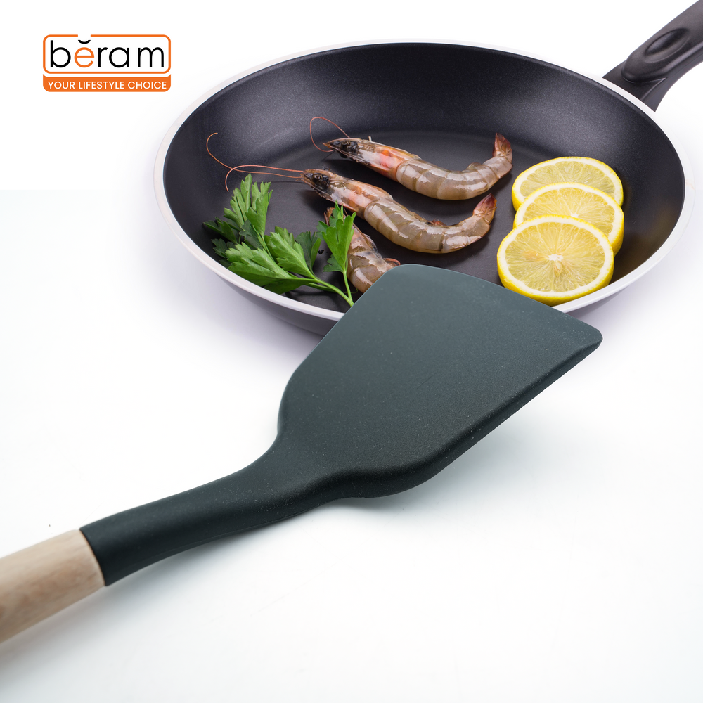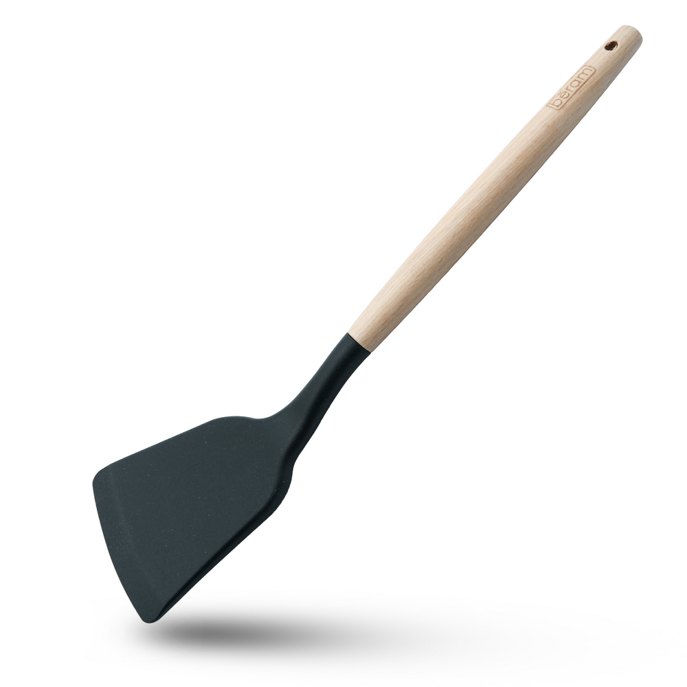 Beram Silicone Turner Cooking Utensil With Wooden Handles Heat Resistant Bpa Free Non-Stick Kitchen Tools For Cooking Baking Mixing Stirring Serving Frying Grilling – Black (Single Turner)