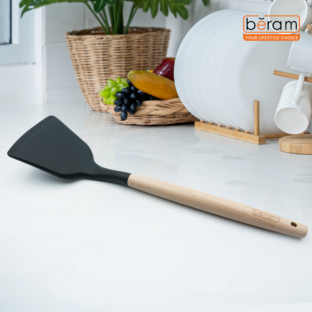 Upgrade your kitchen with the Beram Black Silicone Spatula Turner, crafted for both performance and style. Measuring 8 × 32 cm, this versatile kitchen utensil features a heat-resistant, BPA-free silicone head that is safe for nonstick cookware, ensuring you never scratch or damage your pans. The durable wooden handle provides a comfortable, ergonomic grip and adds a natural charm to your cooking space. Whether you're flipping pancakes, turning eggs, or stirring vegetables, the flexible edge allows for effortless handling. Easy to clean and equipped with a hanging hole for convenient storage, this spatula turner is a must-have tool for modern kitchens.