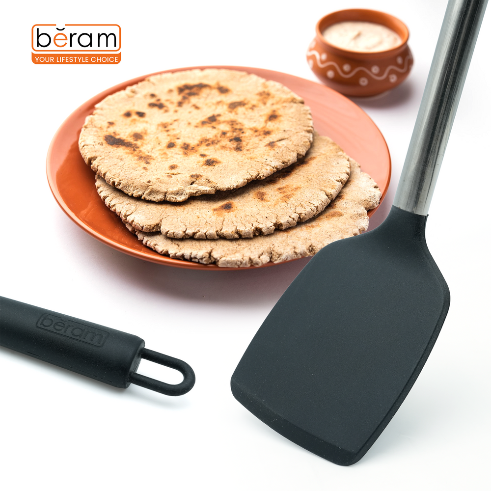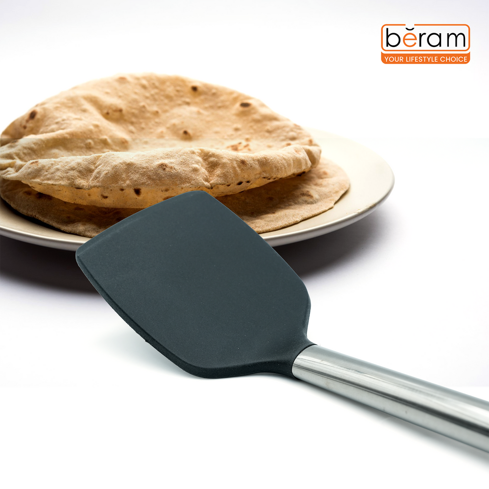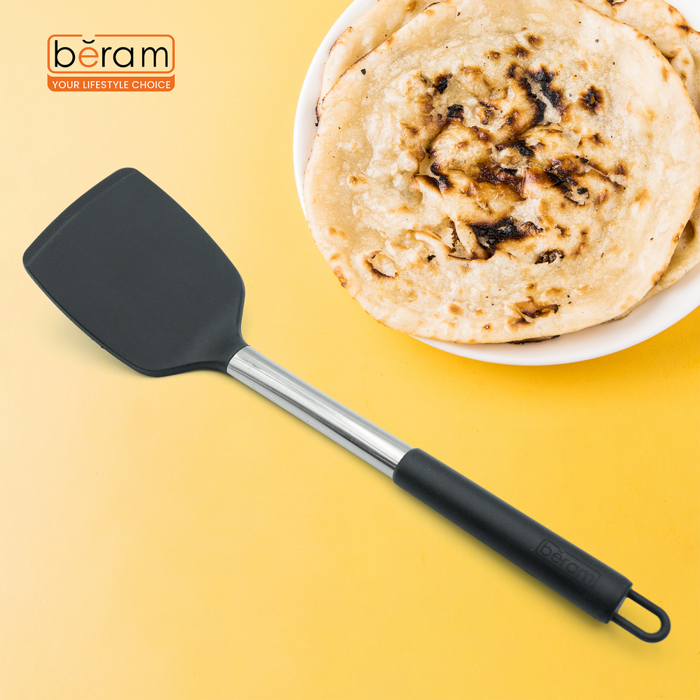 Beram Silicone Turner With Stainless Steel Handles Heat Resistant Kitchen Utensil Non-Stick Safe Bpafree Cooking Tools Spatulas–Black (Single Turner)