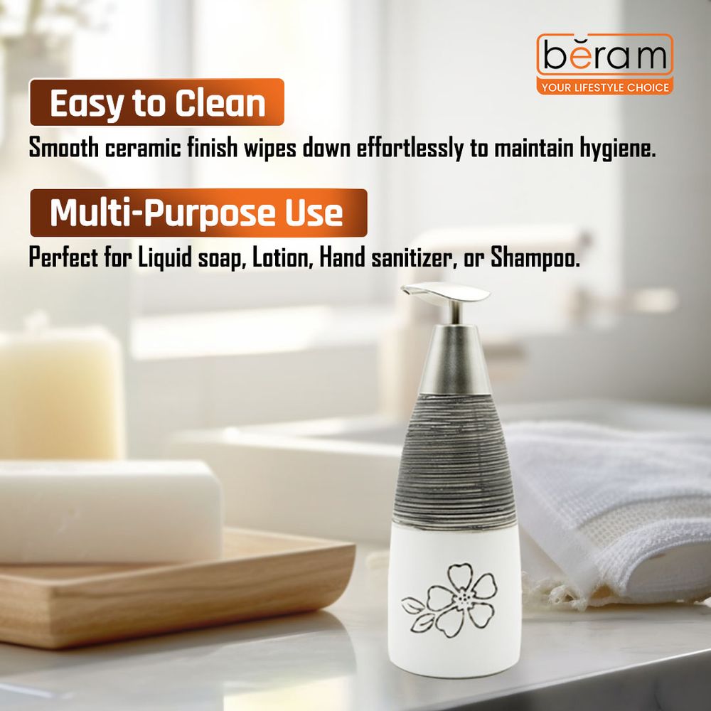 Beram White & Black Flower Design Ceramic Bathroom Accessory Elegant Floral Embossed Soap & Lotion Dispenser Modern Refillable Pump Bottle for Kitchen Vanity & Wash Basin Decor