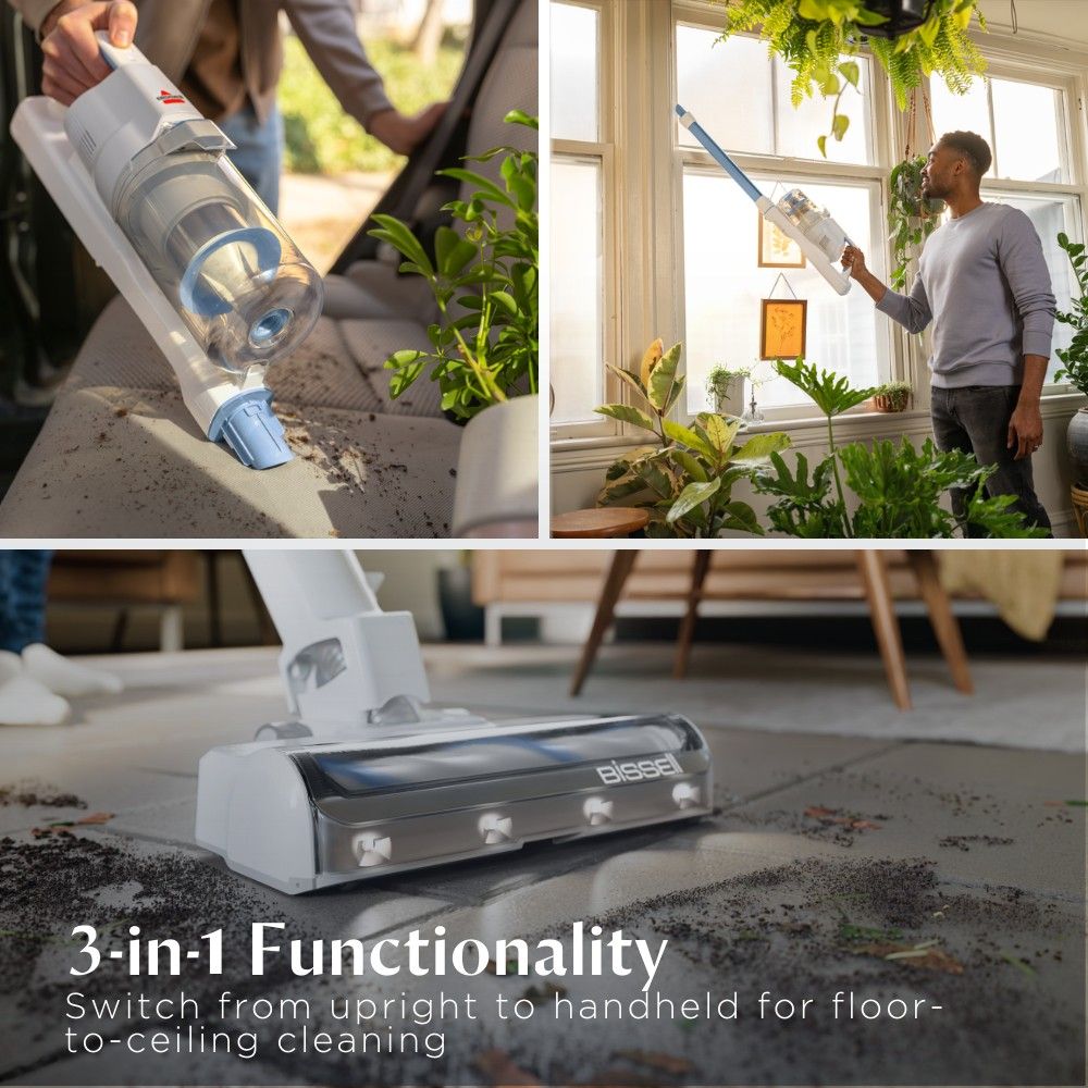 Transforms from stick to handheld or high-reach vacuum for versatile use