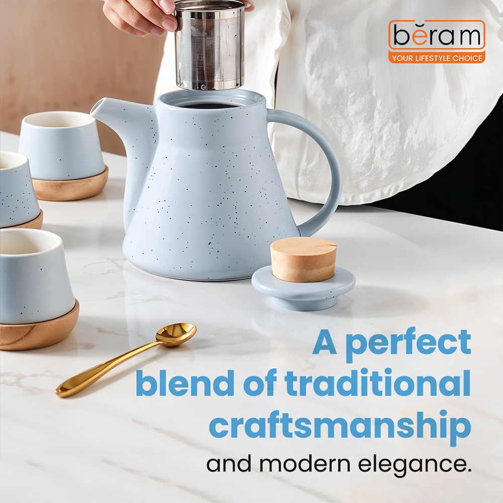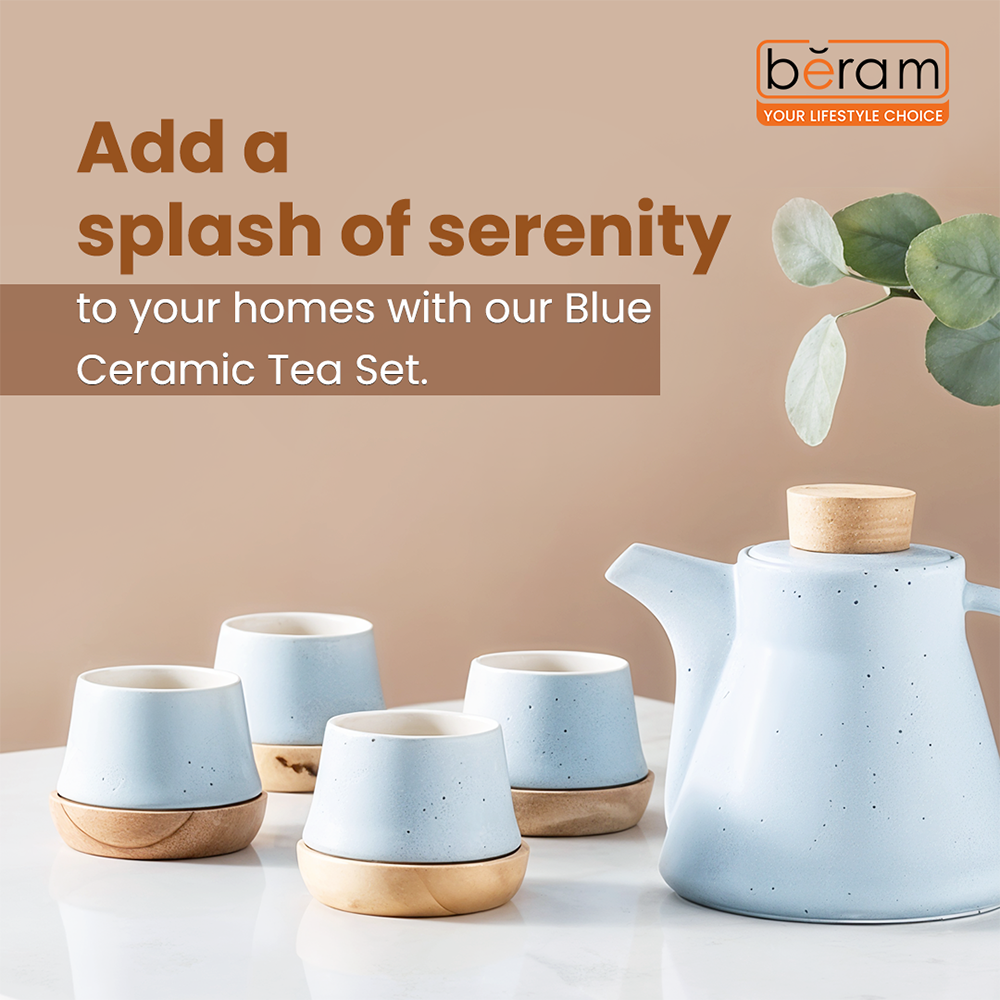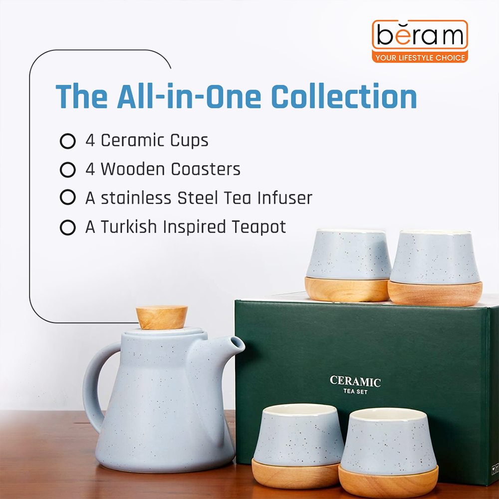 BERAM Ceramic Tea Set 6 Pieces Set Turkish Cups and Saucers Teapot with Removable Stainless Steel Infuser Includes Wooden Coasters Scratch Resistant Decorative Tea Set with Gift Packaging Blue