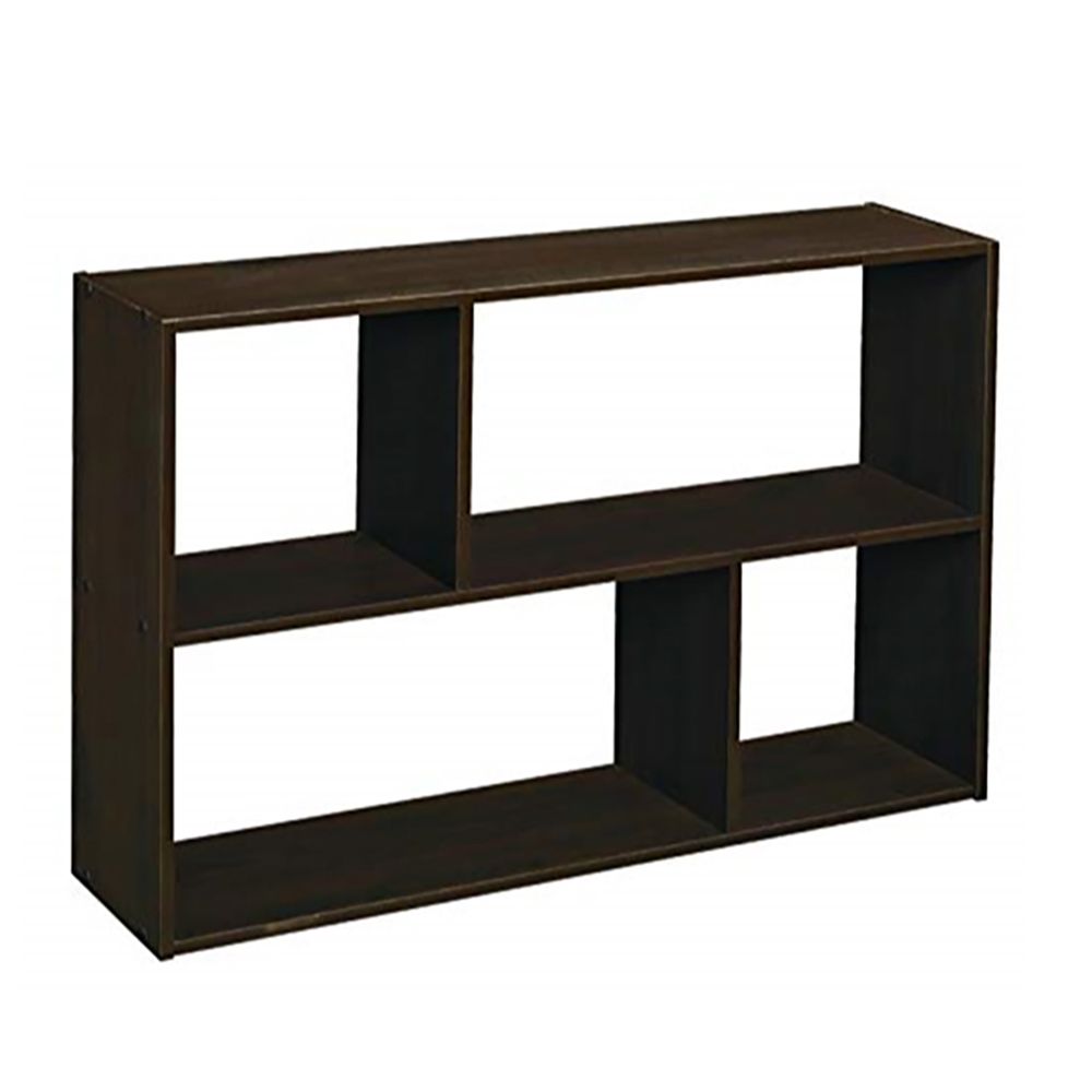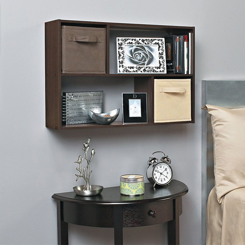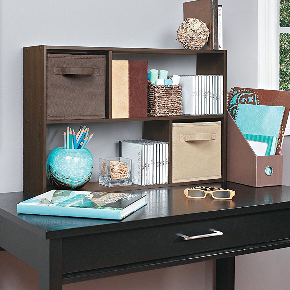 It features multiple compartments, including open spaces and fabric bins for versatile storage options.