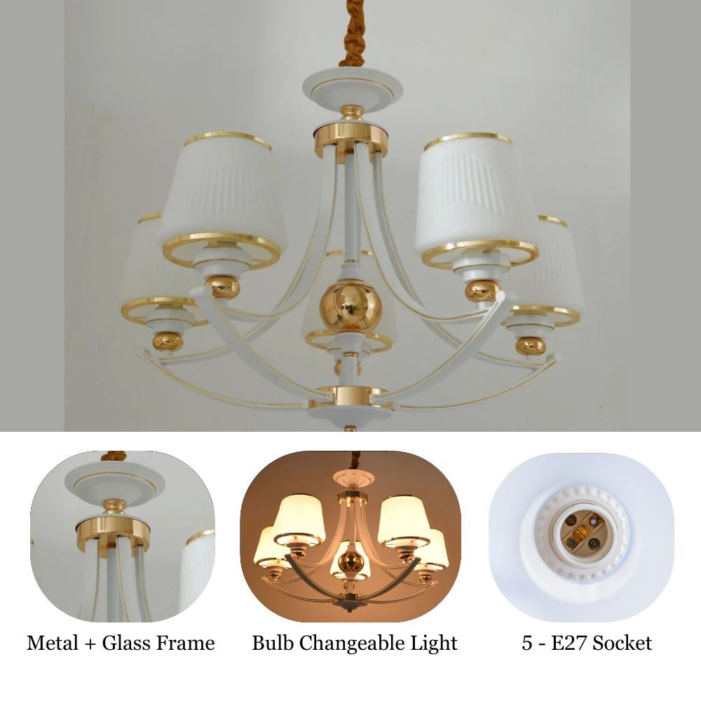 This 5-light chandelier is crafted from high-quality iron and glass to create a solid and durable design. It is compact and stylish enough to illuminate and elevate any given space.
