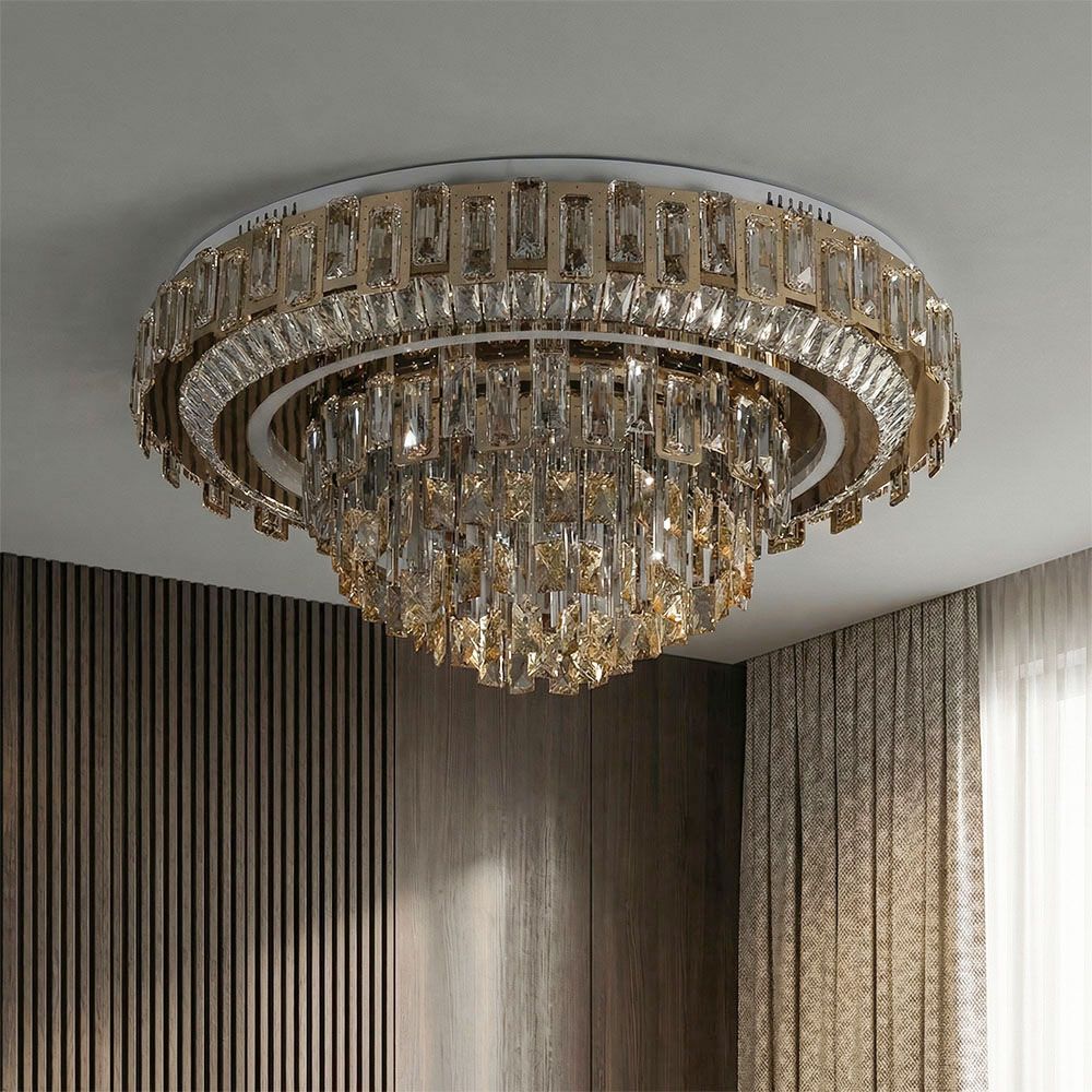 Crafted from stainless steel and crystal, the chandelier showcases a refined look and sturdy build.