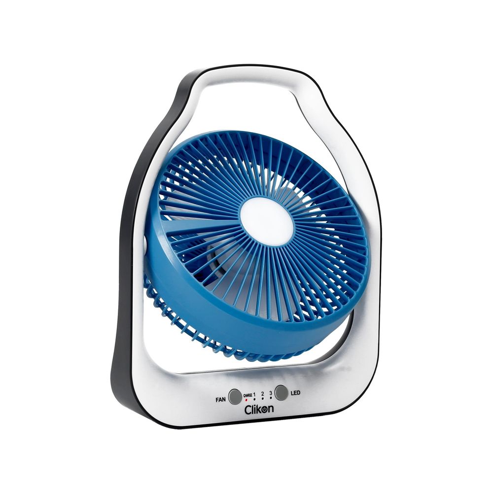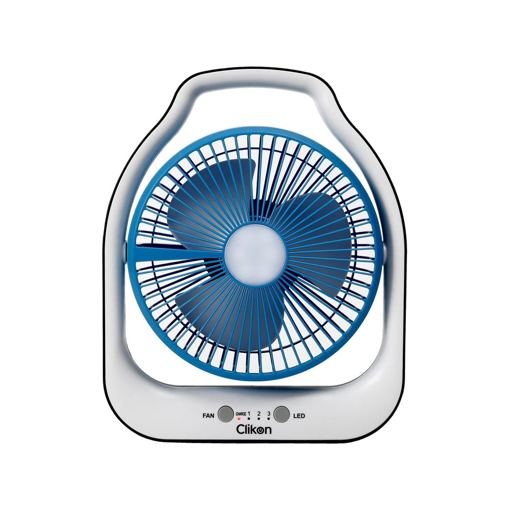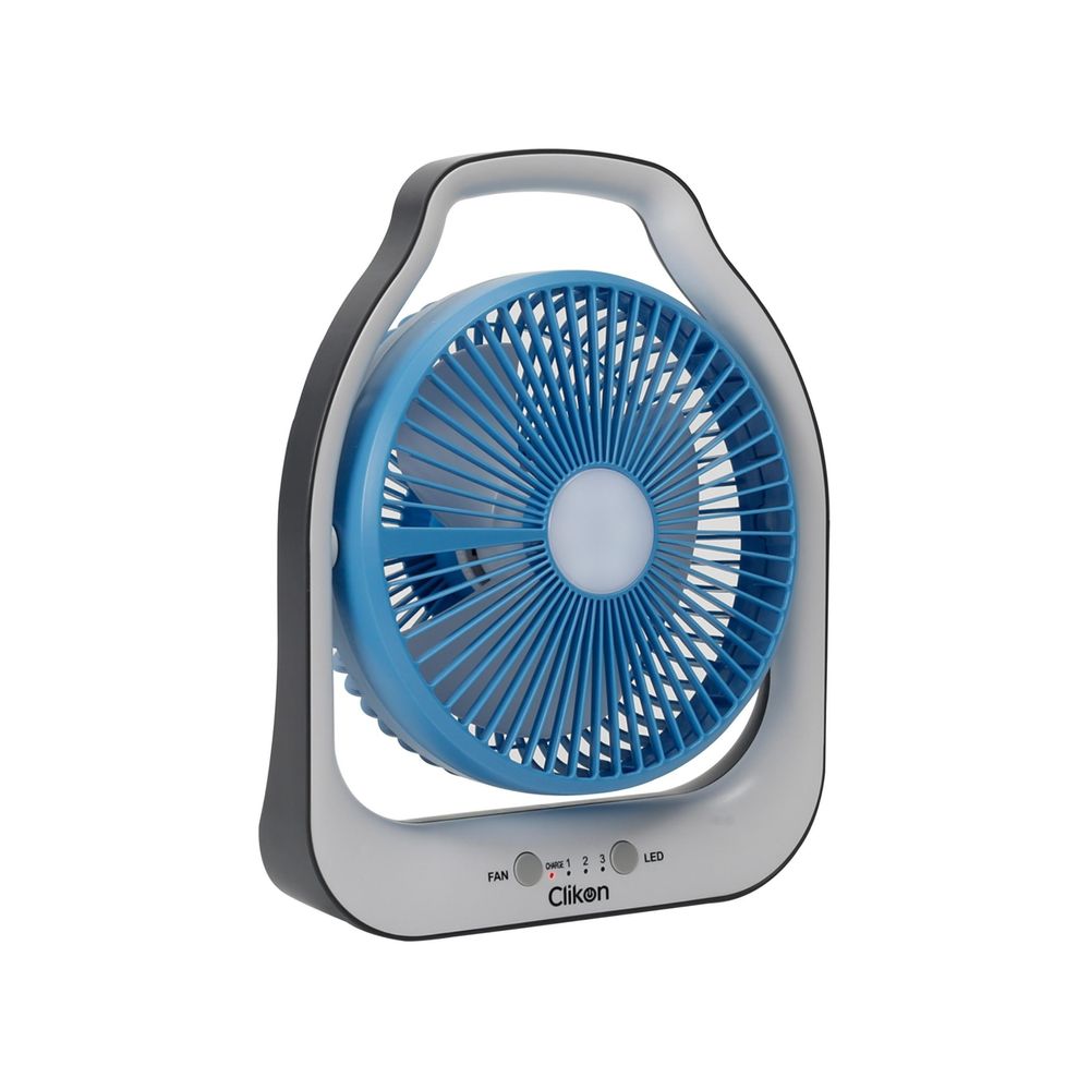 Clikon 8 Inch Portable Rechargeable Fan With Led Light, Smooth Airflow, 3 Speed Modes, Convenient 180° Rotation, 10 Watts, 2 Years Warranty, Blue And White - Ck2038
