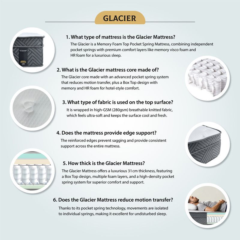 Wrapped in a 280gsm breathable knitted fabric, the Glacier also features an anti-skid base and reinforced borders for added stability and long-lasting performance. Whether you’re a side sleeper, back sleeper, or someone seeking orthopedic-grade comfort, this mattress is tailored for you.