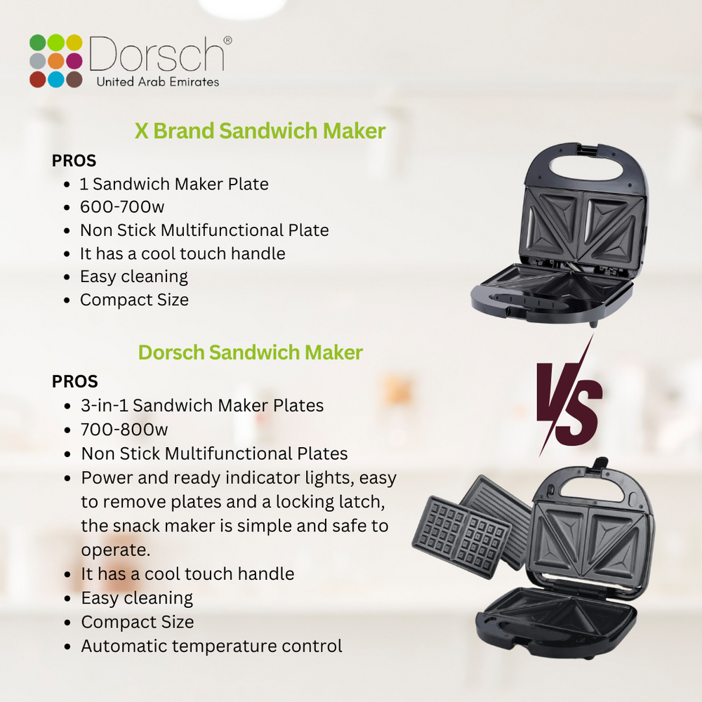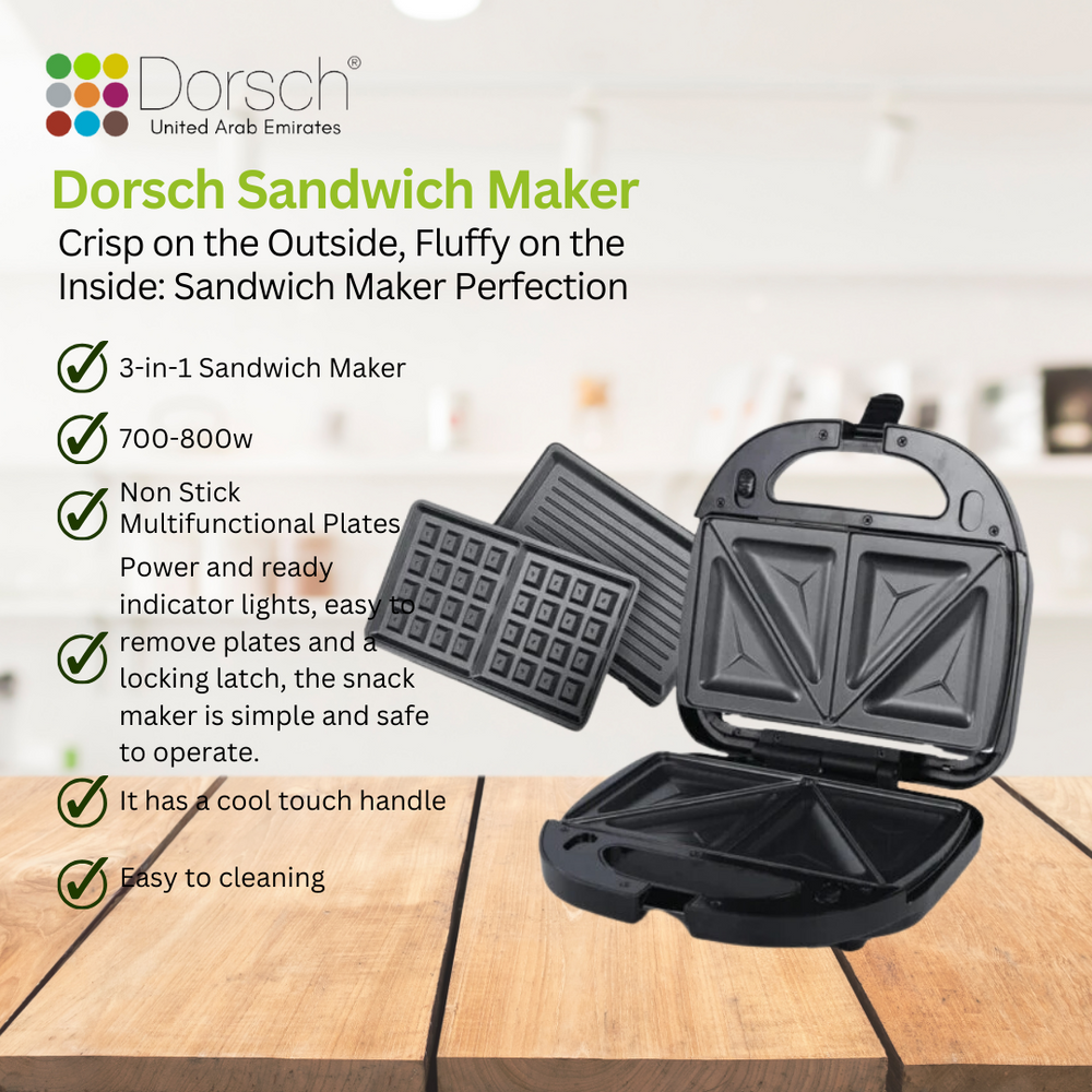 Dorsch SM-30 Sandwich Maker - Versatile 3-in-1 Plate for Sandwiches, Grill, and Waffles - Non-Stick Coating for Effortless Cooking - Includes 2-Year Warranty