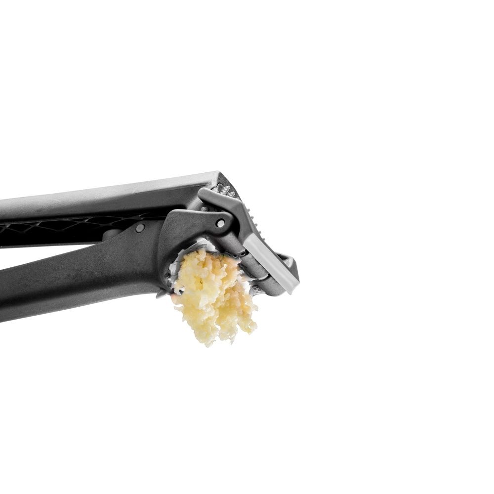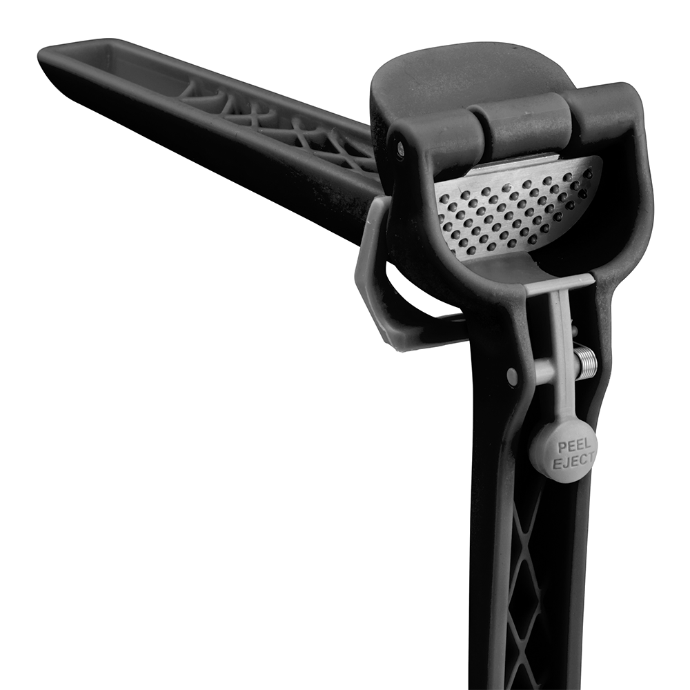 Mess-Free Peel Ejector Button Say goodbye to smelly fingers and garlic skins stuck in your press. With a simple push of the built-in eject button, the leftover peel is instantly released into the trash. No touching, no scraping, and no mess on your hands—just clean, fresh garlic every time. This thoughtful design makes it hygienic, hassle-free, and ideal for anyone who loves flavorful meals without the tedious prep work.