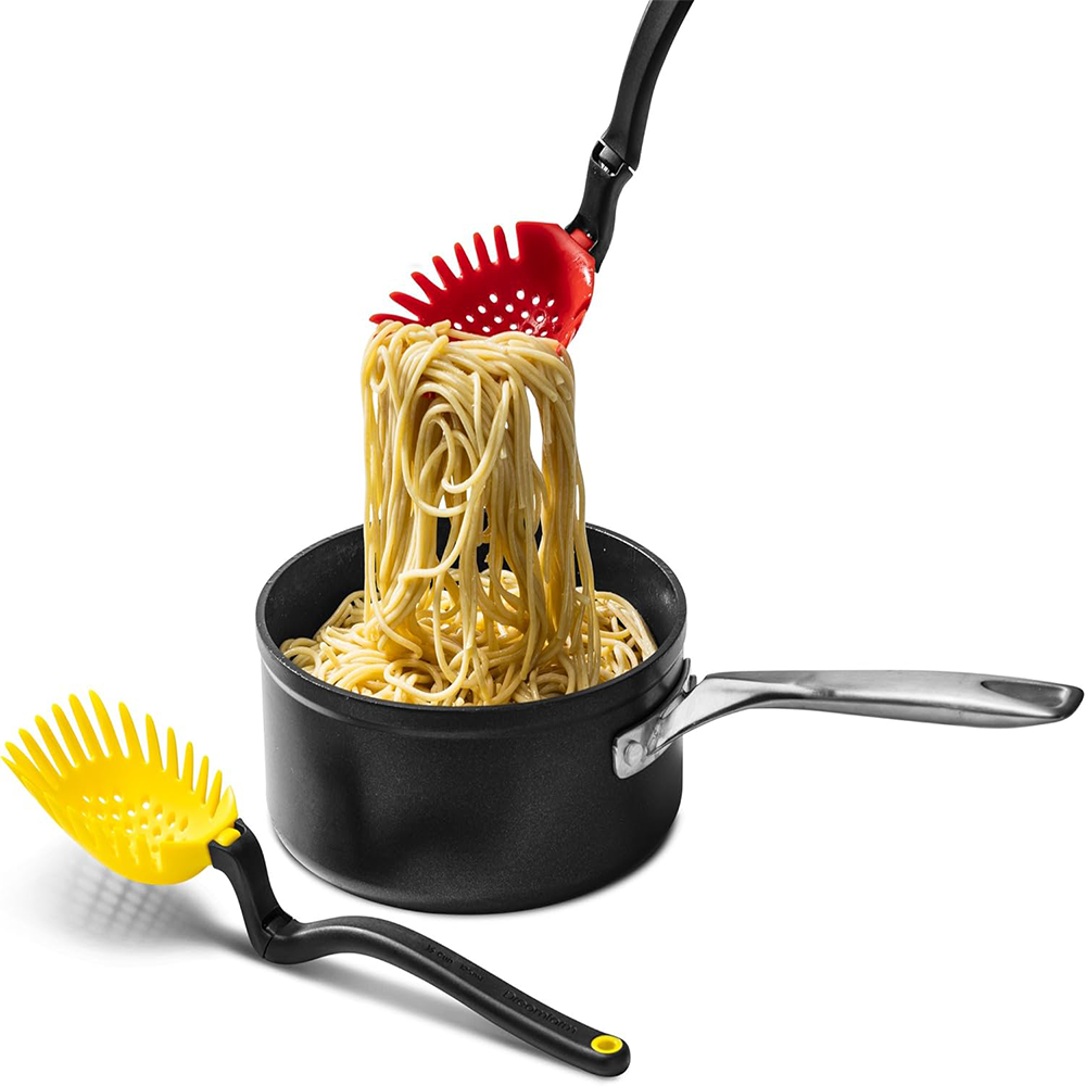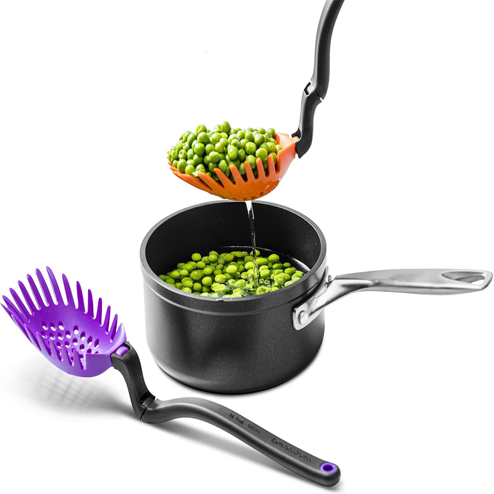 ONE HEAD, MANY FACES Cooking doesn't have to be draining, but these holes sure are! The drainage holes allow you to drain food like peas or pasta, without scratching your non-stick pots and pans. Heat resistant and dishwasher safe.