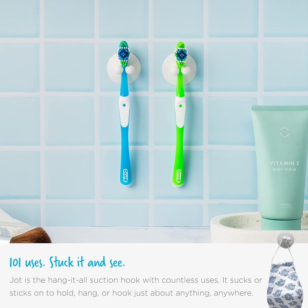Each pack includes 4 suction hooks, giving you multiple organization options around your home or workspace. Compact and lightweight, the Jot is travel-friendly, making it easy to carry when you need extra storage on the go. Unlike traditional hooks that require nails, screws, or adhesives, the Jot provides a quick, damage-free, and reliable hanging solution in seconds.