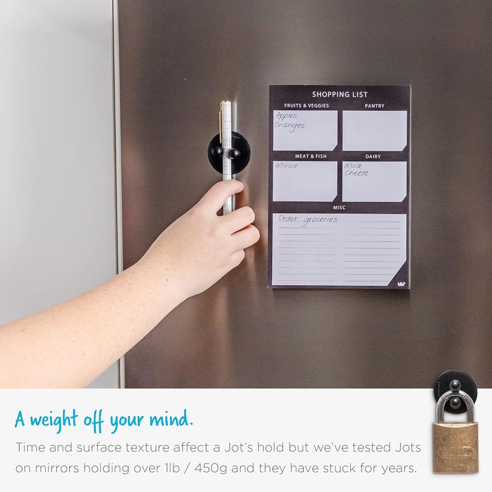 STICKY TRICKY For trickier surfaces, the Jot comes with adhesive plastic discs to stick anywhere. It’s great for rougher surfaces like wood, just peel off the double-sided tape on the disc. (Don’t worry, the glue won’t damage painted walls).