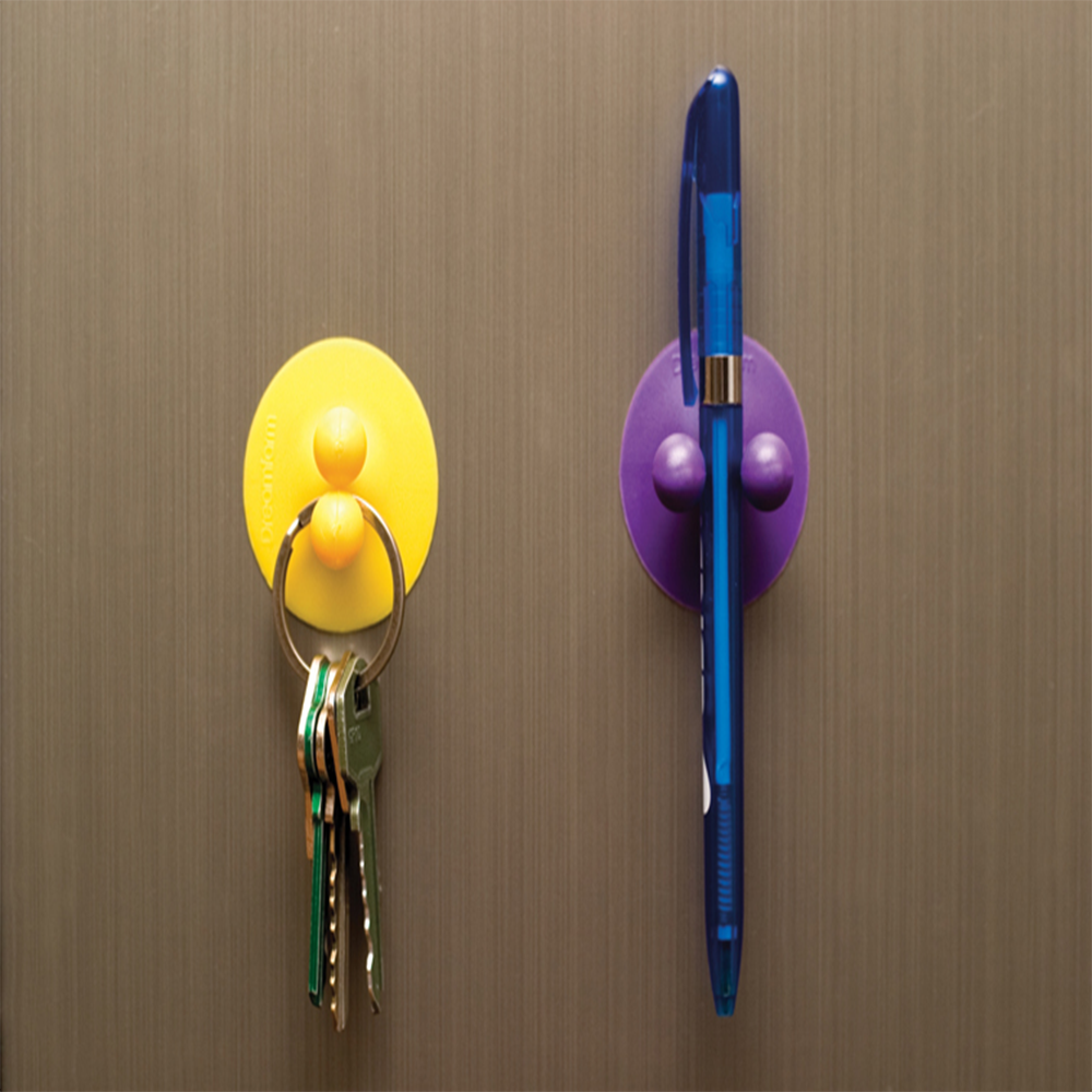 STICKY TRICKY For trickier surfaces, the Jot comes with adhesive plastic discs to stick anywhere. It’s great for rougher surfaces like wood, just peel off the double-sided tape on the disc. (Don’t worry, the glue won’t damage painted walls).