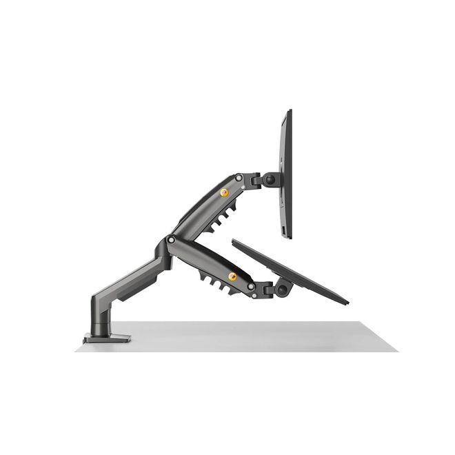 The product Dual Monitor Arm Desk Gas Spring Mount Supports Two 17" to 27" Computer Screens up to 19.8 lbs each, VESA 75x75 & 100x100 Compatibility, Tilt, Swivel & 360° Rotation for Ergonomic Positioning, Black images have props used for illustrative purposes. Product Color may vary slightly due to photographic lighting or your screen settings.