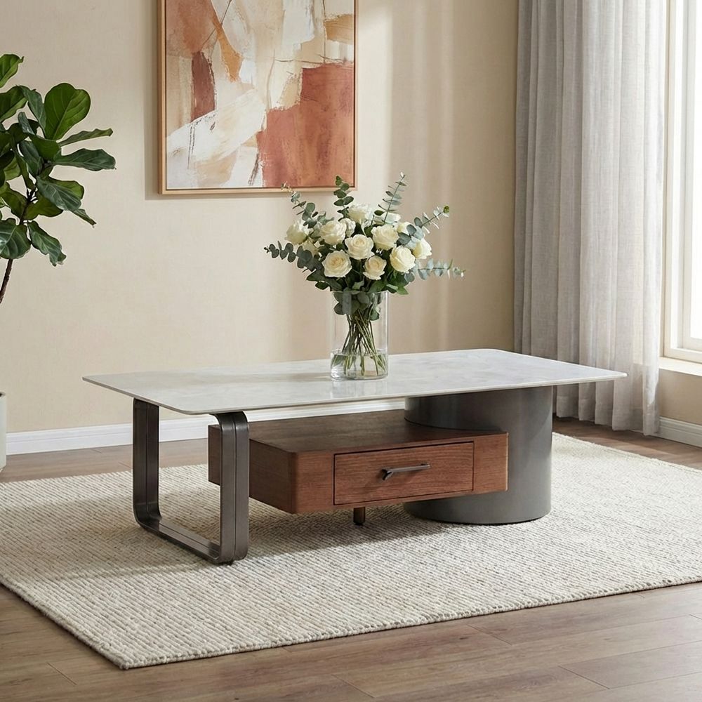Crafted from high-quality wood, sturdy metal, and refined sintered stone, the table offers exceptional durability and a sleek finish.