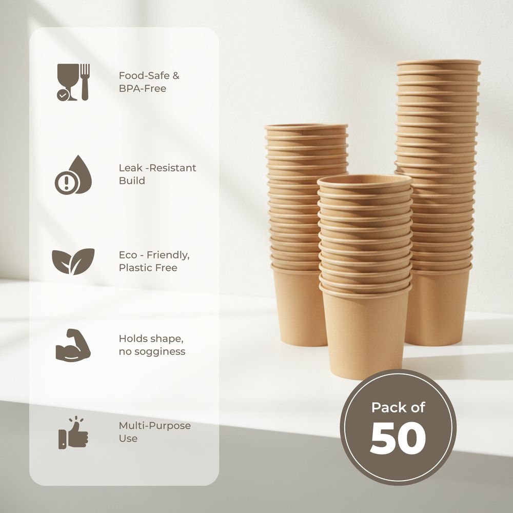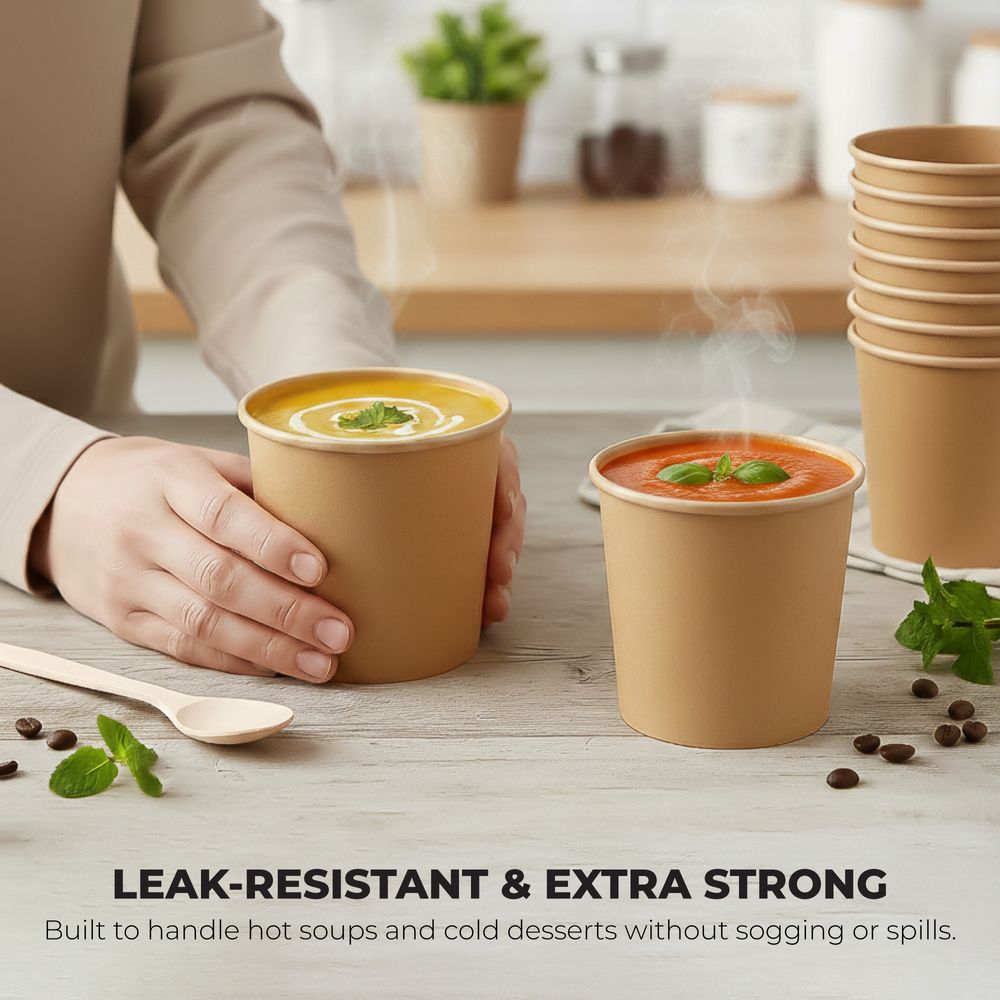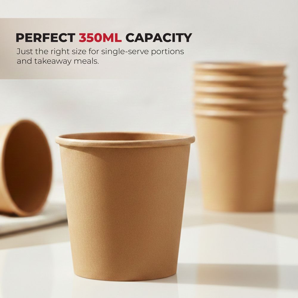 Our 350ml Disposable Paper Kraft Soup Cups are strong, disposable containers designed for serving soups, coffee, tea, desserts, and other hot or cold foods, made from food-safe, BPA-free paper that is leak-resistant and sturdy for reliable everyday use. Featuring a natural brown kraft finish, they provide a clean, professional appearance suitable for restaurants, cafés, food trucks, and home settings, while their compostable design offers an eco-friendly alternative to plastic and supports sustainable packaging. Lightweight, durable, and convenient, these cups deliver a practical solution for clean and hassle-free serving.