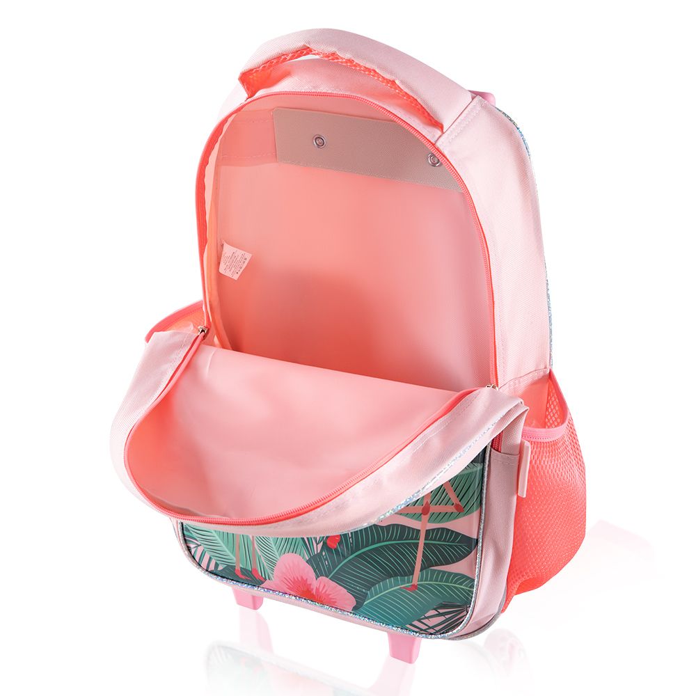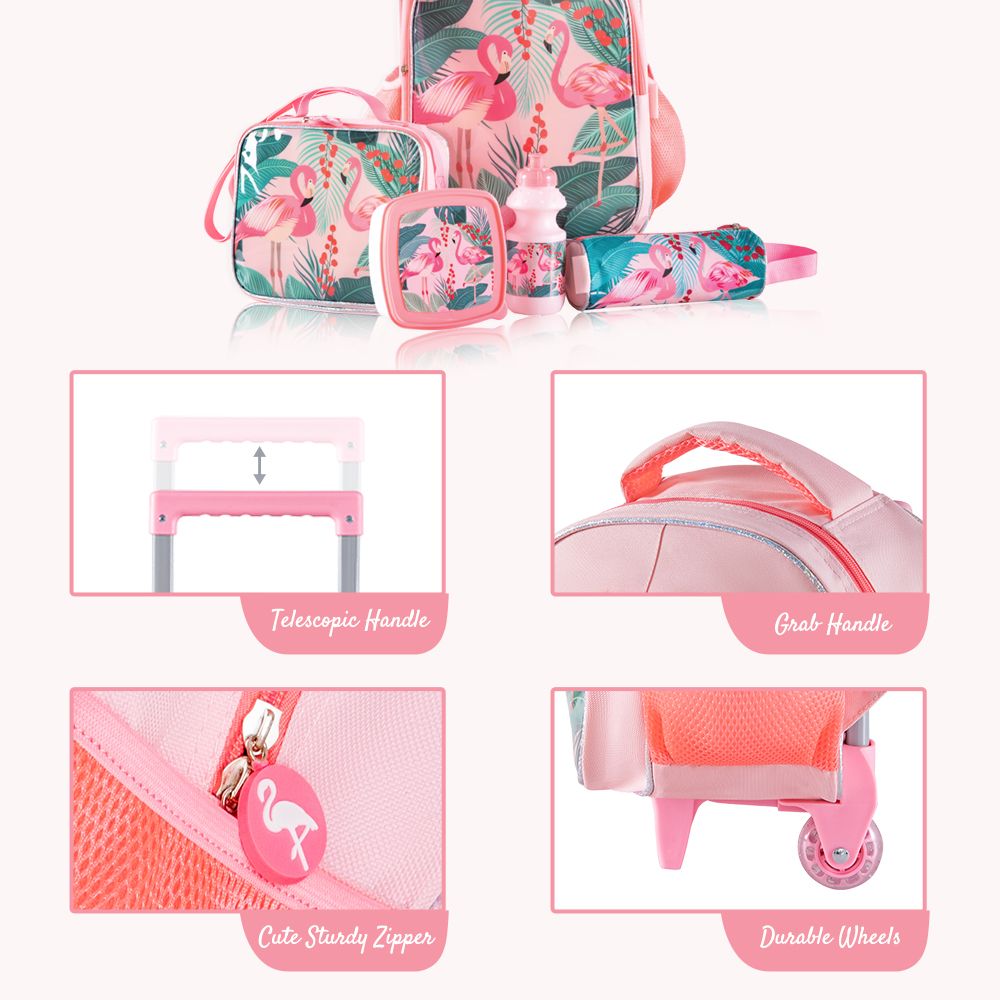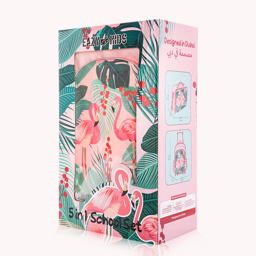 Eazy Kids 17Inch Set of 5 Trolley School Bag with Lunch Bag, Pencil Case, Lunch Box and Water Bottle Tropical - Pink