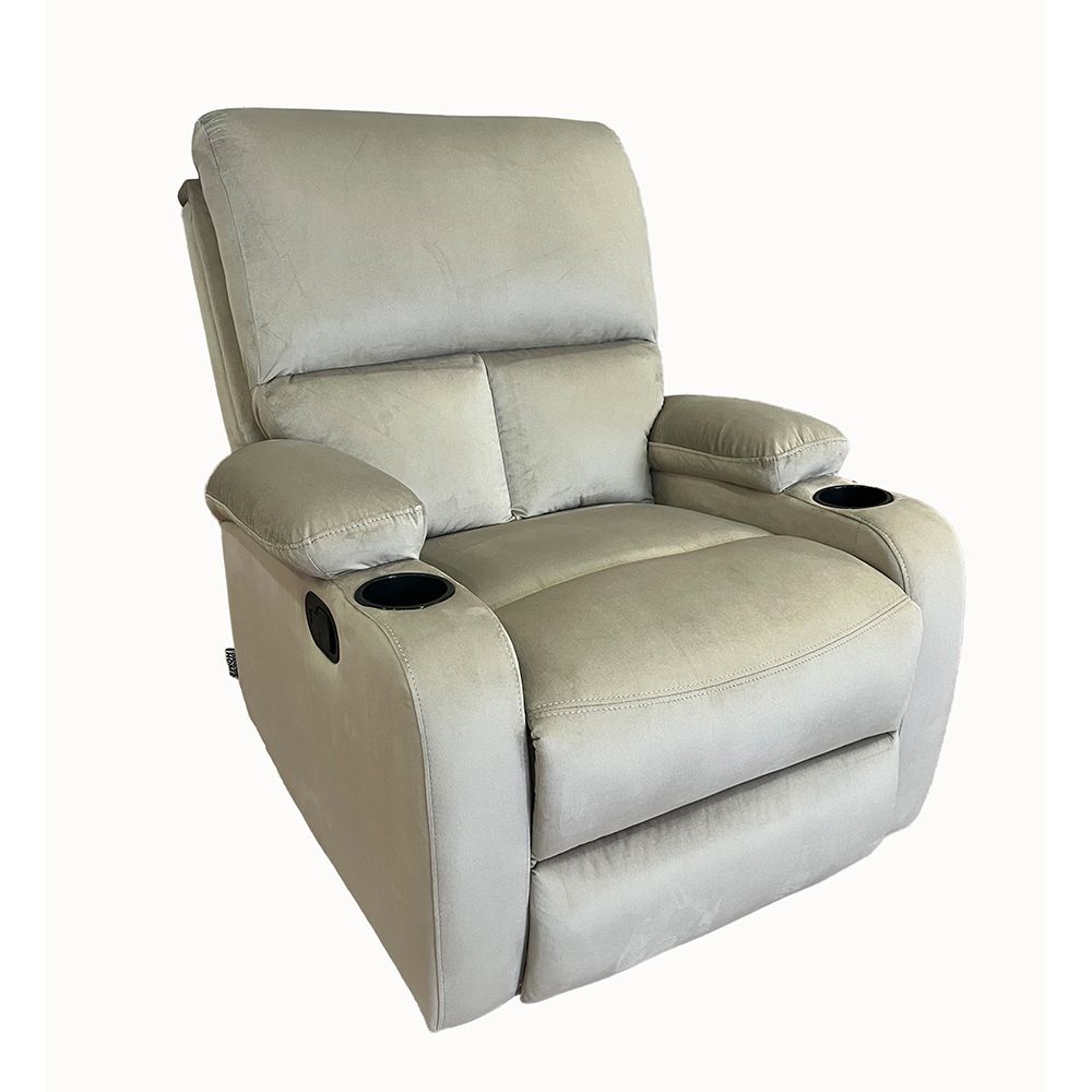 The product Eliana Fabric Recliner With Cupholder - Khaki images have props used for illustrative purposes. Product Color may vary slightly due to photographic lighting or your screen settings.